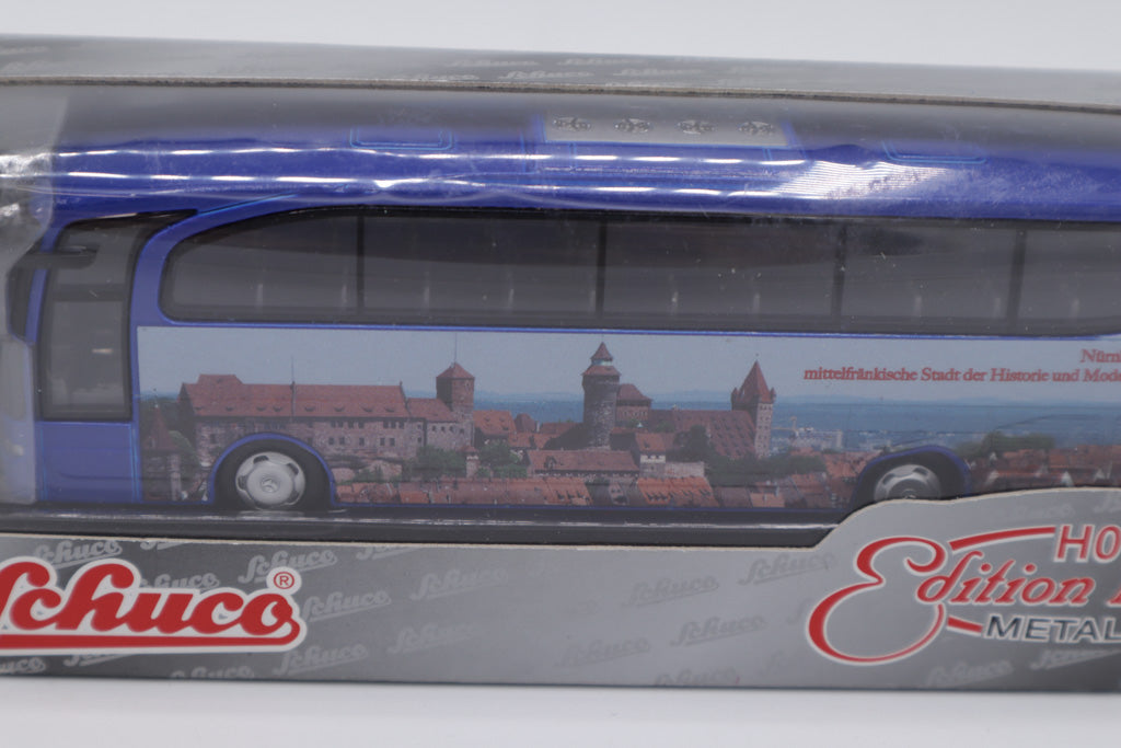 This Schuco HO Edition 1:87 diecast coach features a detailed Setra bus decorated with scenic graphics of Nürnberg, highlighting its blend of history and modernity. A finely crafted model, it is ideal for HO collectors and German vehicle enthusiasts.