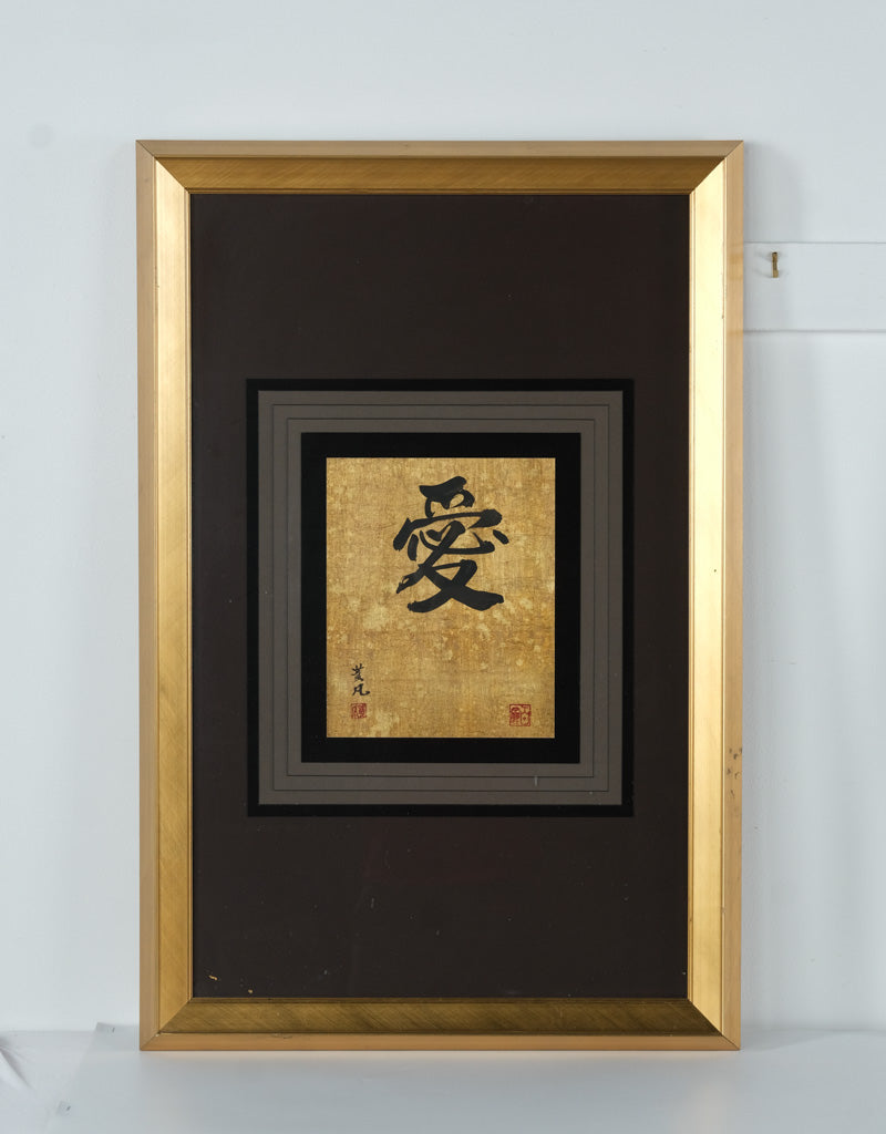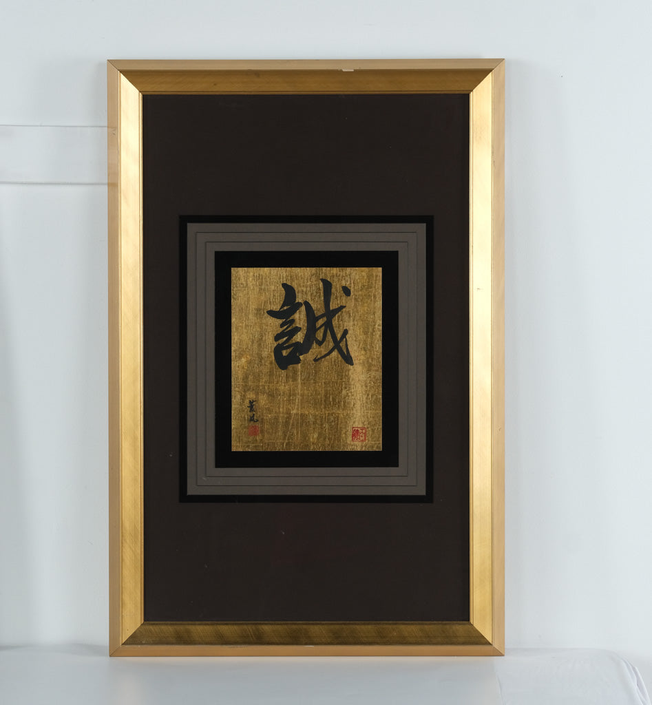 Bring timeless serenity and balance to your space with this striking pair of framed Japanese calligraphy prints. Each artwork features a beautifully rendered kanji character—“愛” (Love) and “誠” (Sincerity)—expertly brushed in bold black ink against a textured gold-toned background. The pieces are double-matted with deep black borders and finished in sleek gold-tone wooden frames, creating a sophisticated contrast that complements both modern and traditional interiors. Ideal for living rooms, offices, or meditation spaces, this pair evokes harmony, mindfulness, and artistic refinement.