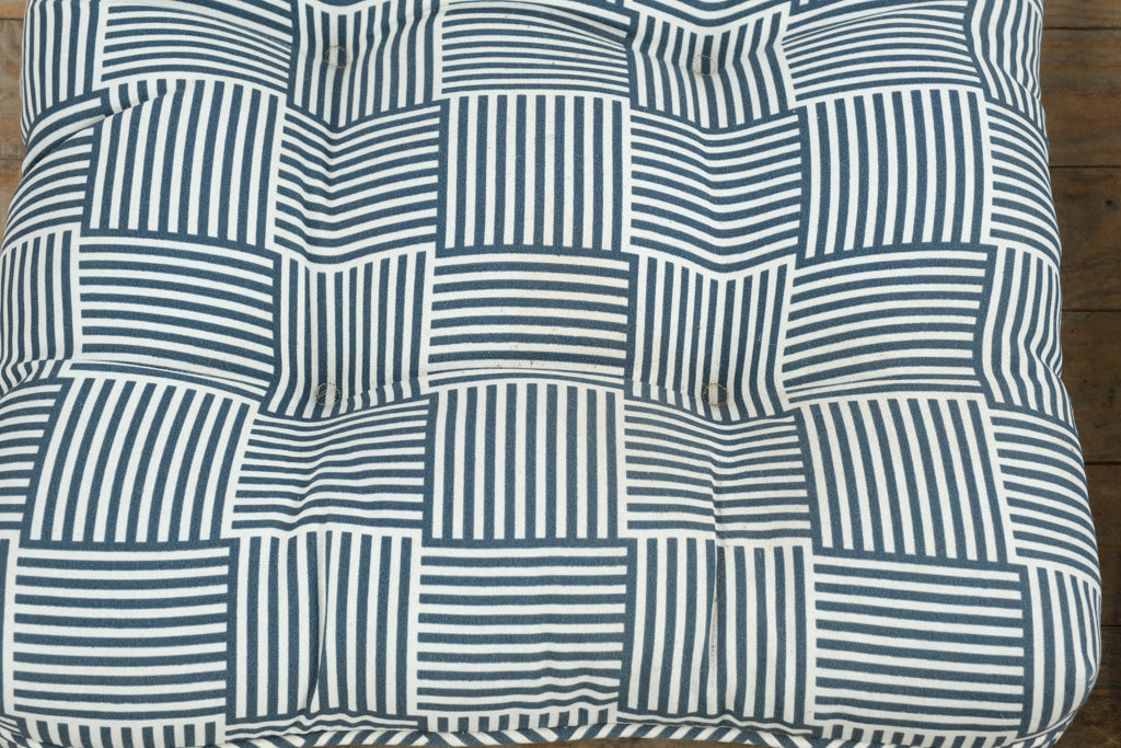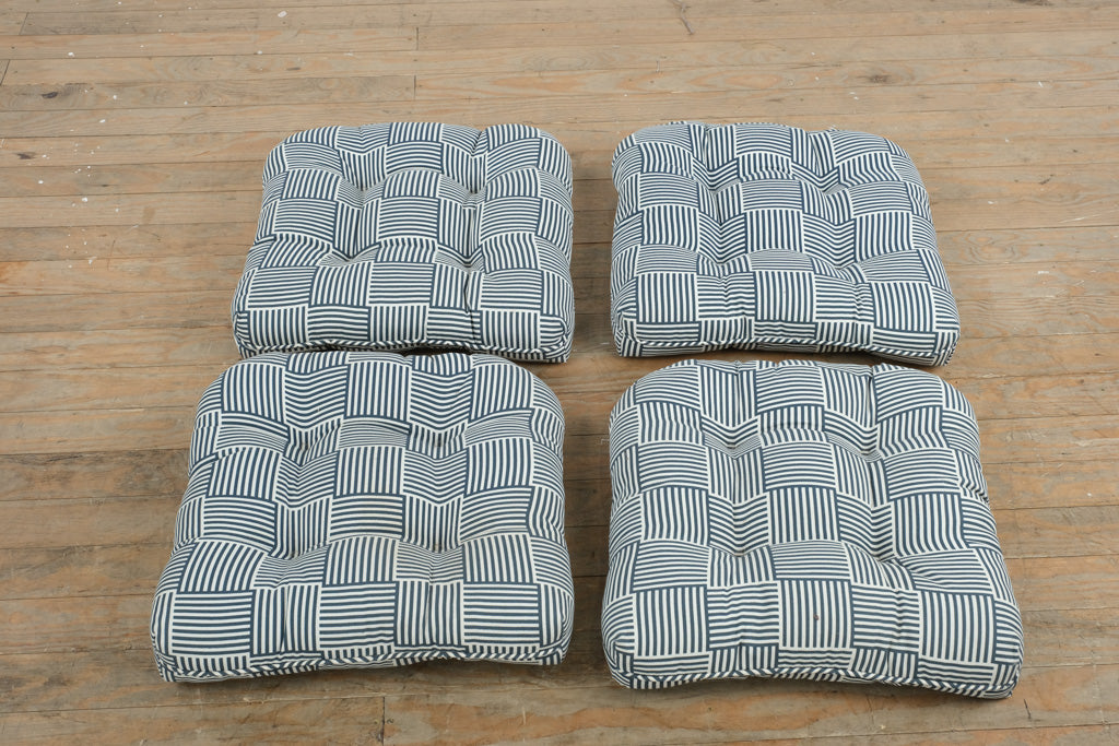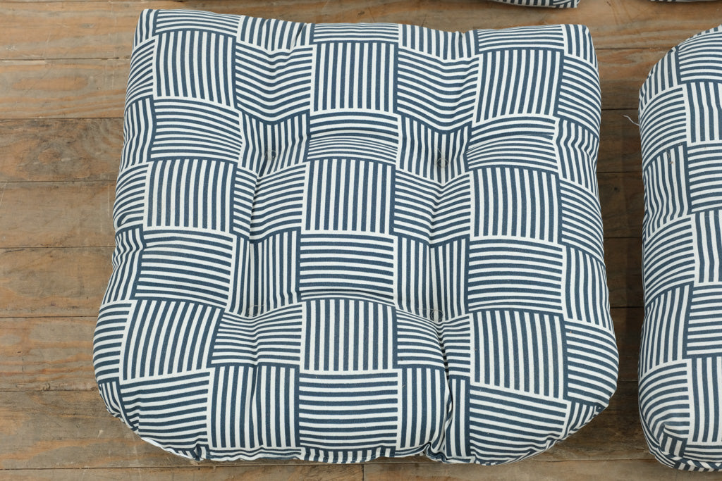 Brighten your dining or patio seating with this stylish set of four blue and white striped chair cushions. Featuring a bold geometric stripe pattern and soft tufted detailing, these 19-inch square cushions add both comfort and contemporary flair. The generous 3.5-inch thickness offers plush support, while the crisp navy-and-ivory color scheme complements a wide range of interior and outdoor styles. Perfect for kitchen chairs, breakfast nooks, or outdoor seating areas, these cushions combine durability with timeless design.
