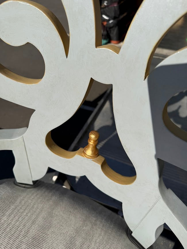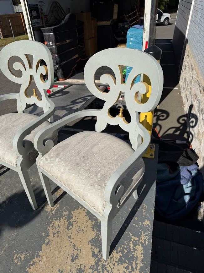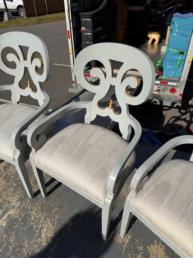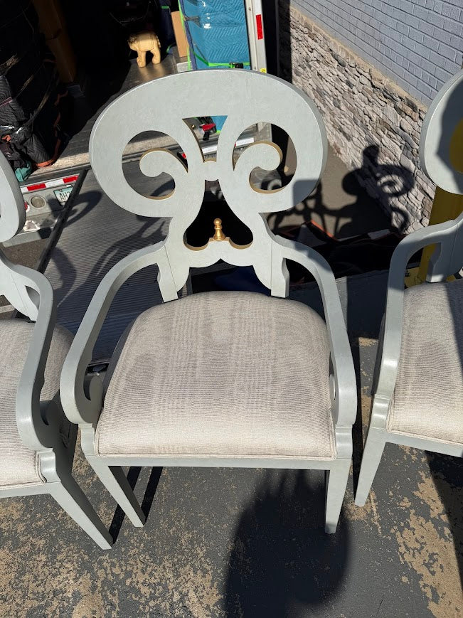 With their whimsical scroll backs and refined coastal palette, these chairs make a sophisticated statement around a dining table, at the ends of a long harvest table, or as standout accent chairs in an entryway or living space. Their weight and craftsmanship underscore their quality, and their history—as pieces originally costing $1,000 each—adds an appealing sense of provenance.