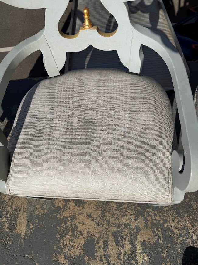 Expertly crafted and notably heavy, these chairs reflect the high-quality construction Somerset Bay is known for. The carved backs feature graceful scrollwork with a central finial accent, while the solid frames and shaped arms demonstrate excellent joinery. Upholstered seats offer a soft, neutral fabric that complements the painted finish.