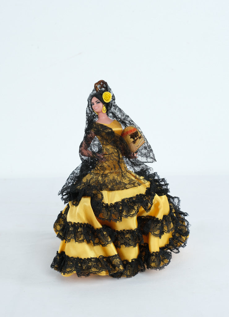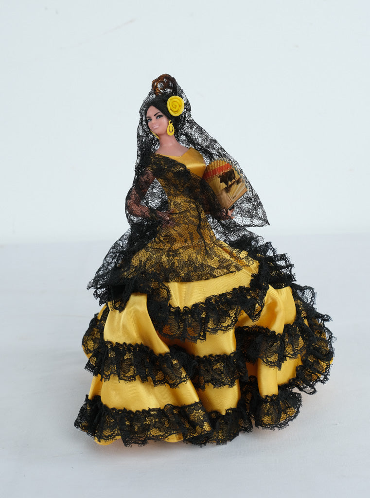Striking vintage Spanish flamenco dancer doll featuring a bold yellow satin gown layered with dramatic black lace ruffles. This classic souvenir-style figure captures traditional Andalusian costume elements, complete with mantilla veil, floral hairpiece, earrings, and decorative hand fan. A vibrant display piece with strong visual presence at 10 inches tall.