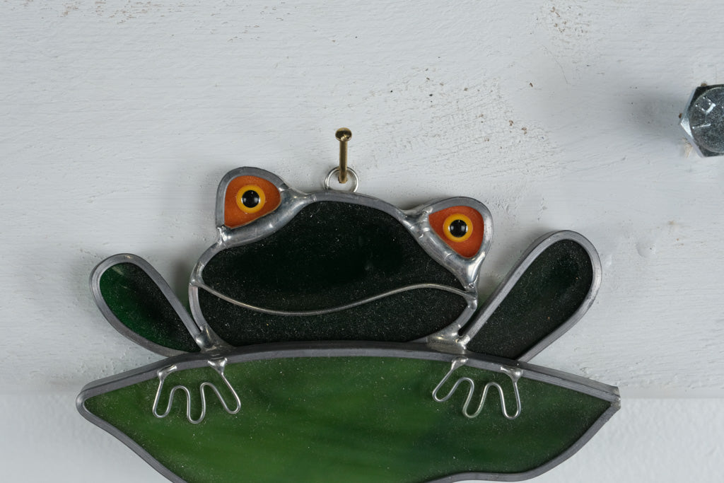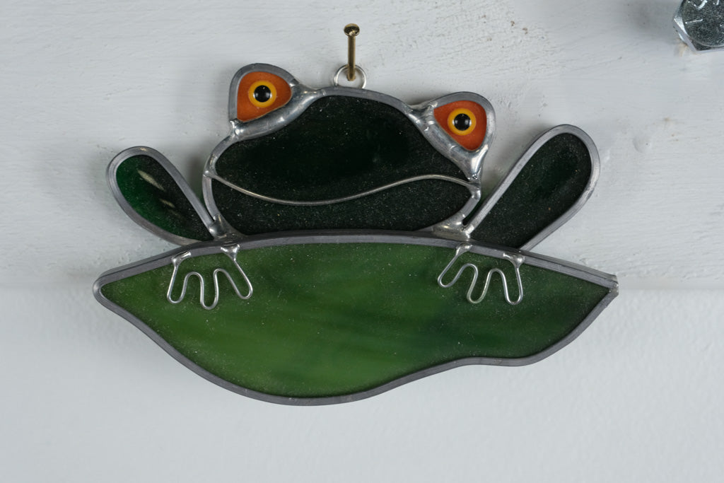 Add a splash of color and whimsy to your window with this vintage stained glass frog sun catcher. Handcrafted in classic Tiffany-style stained glass, this charming frog features vivid green glass with bright orange eyes and silver-tone soldered outlines. The playful design shows the frog peeking over a lily pad — a delightful touch for any sunlit window, garden room, or nature-inspired decor.