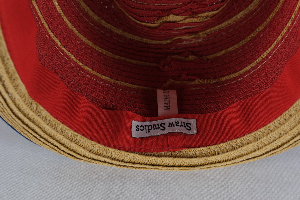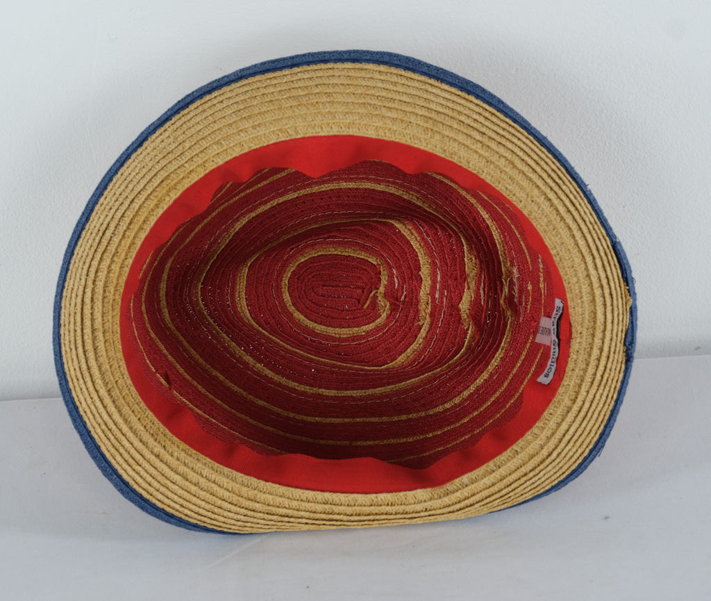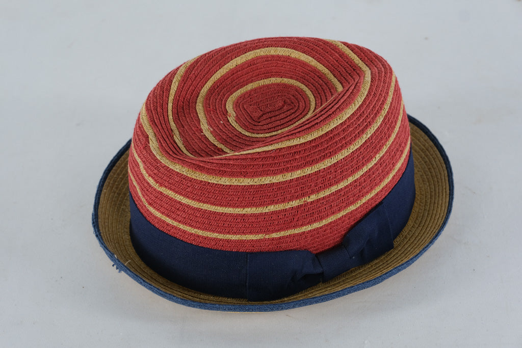 Bring a pop of color and creativity to your look with this Straw Studios woven fedora hat. Featuring bold red and tan spiral stripes, accented by a deep navy blue band and brim edge, this hat perfectly balances playful design with relaxed sophistication. The lightweight woven material offers comfort and breathability, making it ideal for sunny days, outdoor gatherings, or adding flair to a casual outfit.