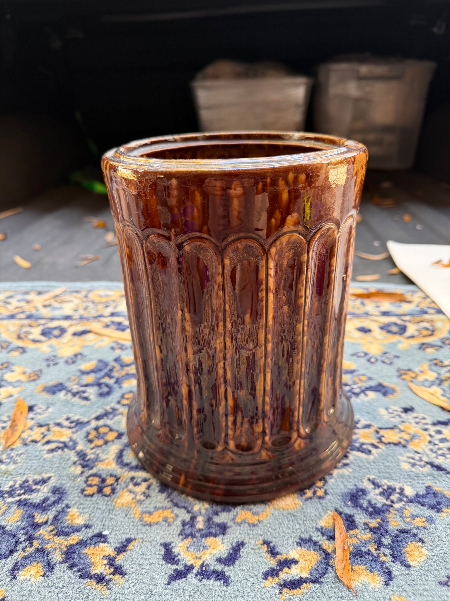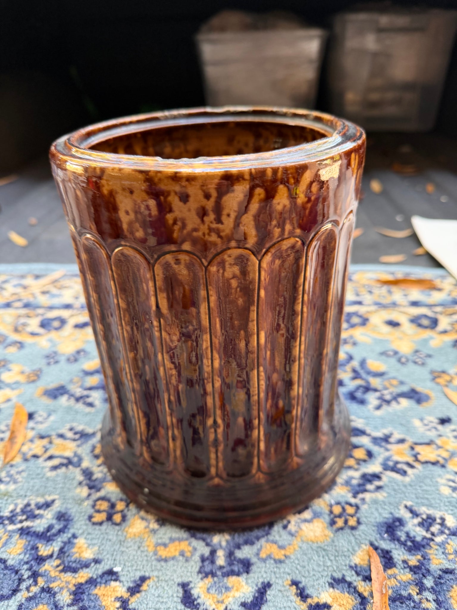 A handsome piece of utilitarian pottery, this vintage brown glazed stoneware crock captures the rustic charm of early-to-mid 20th-century American kitchenware. With its deep chocolate-brown glaze and classic vertical ribbed “barrel” design, this crock was likely used for storing butter, pickles, or preserves — a fine example of durable craftsmanship from a bygone era.