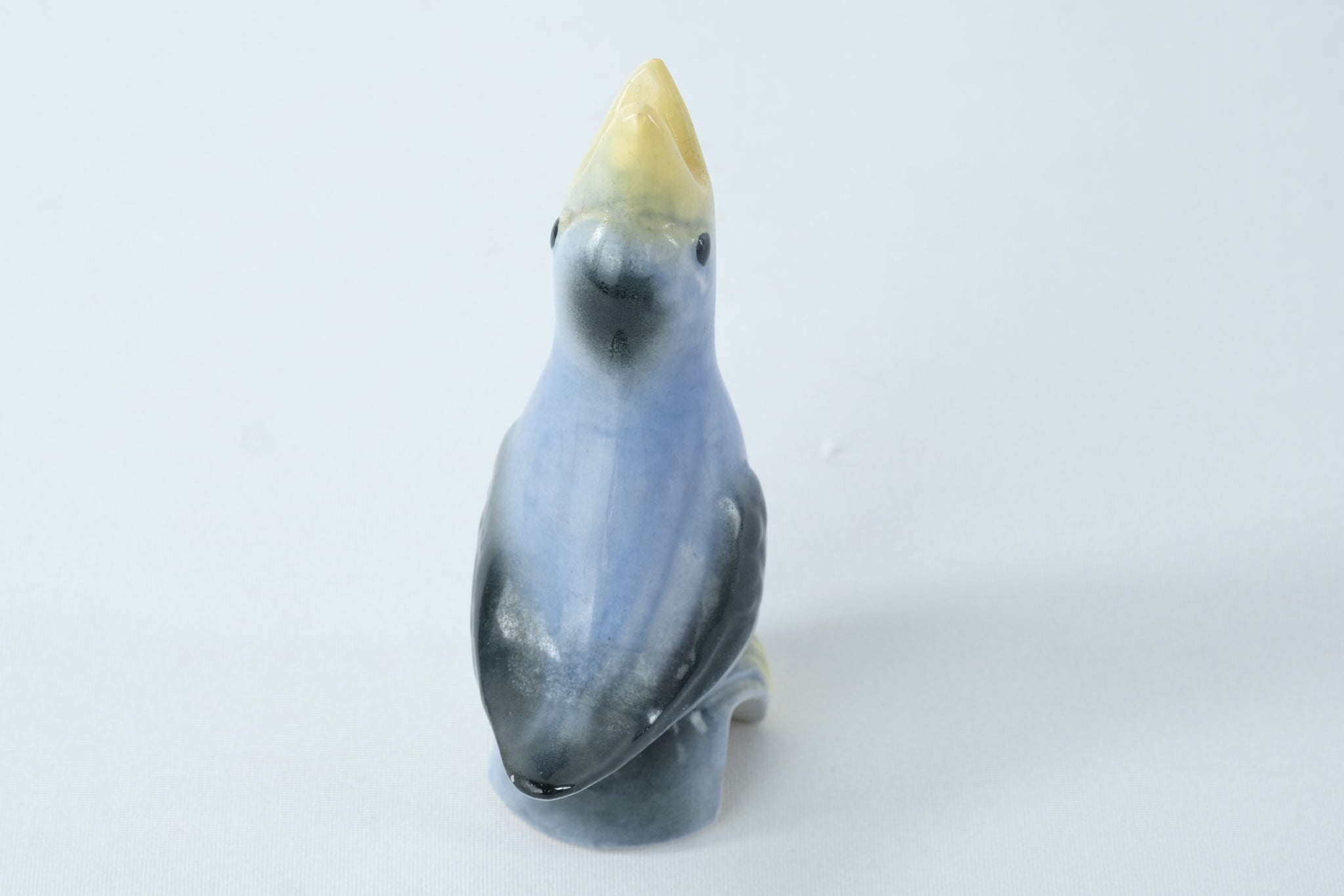 Design: Hand-painted ceramic bird in soft blue, gray, and yellow with a glossy glaze