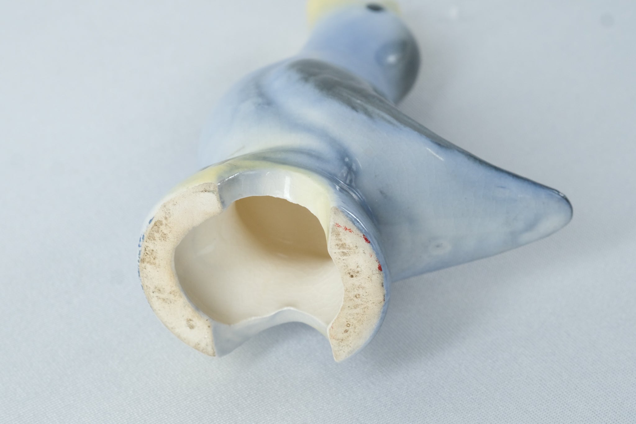 Unlike a simple figurine, this piece is interactive and functional. Fill the bird with a small amount of water and blow gently through the tail opening — the whistle produces a sweet, trilling sound that closely mimics birdsong. These playful whistles were once popular as souvenirs and children’s toys, making them delightful pieces of mid-20th century ceramic folk art.