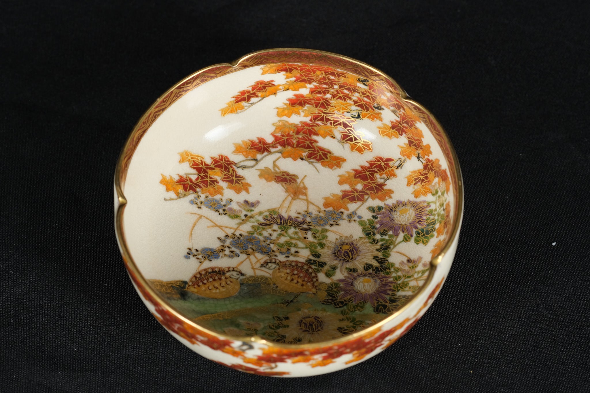Vintage Japanese Satsuma-Style Hand Painted Bowl with Maple Leaves, Birds & Gold Trim – 5"