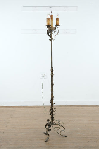 Wrought Iron Candelabra Floor Lamp – Three-Light Gothic Revival Torchère with Scrollwork Base