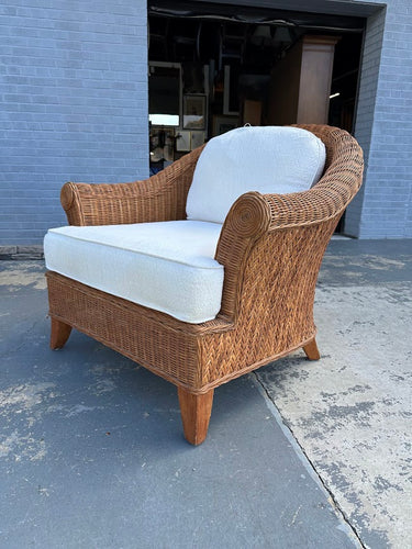 Ethan Allen Curved Rattan Armchair with White Cushions