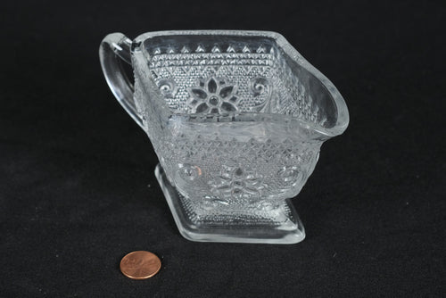 Vintage Pressed Glass Creamer with Floral & Diamond Pattern – 5.5" Wide