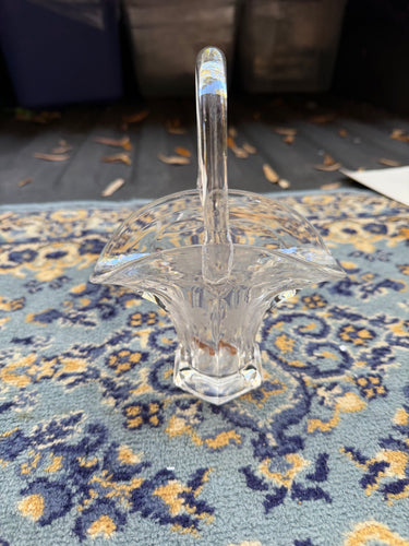 Vintage Etched Glass Basket Vase – Clear Pressed Crystal Flower Design, 8” Handled Decorative Centerpiece