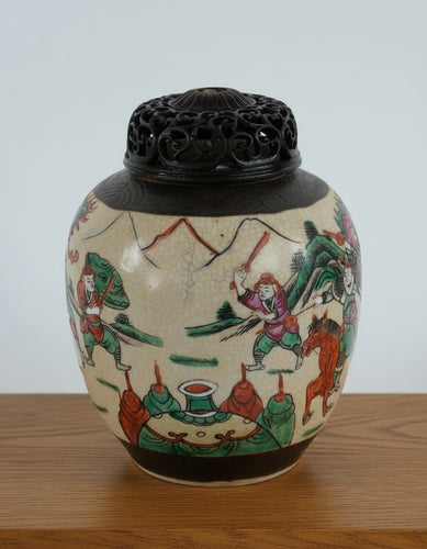 Vintage Chinese Crackle Glaze Ginger Jar with Carved Wood Lid β Hand-Painted Warrior Scene