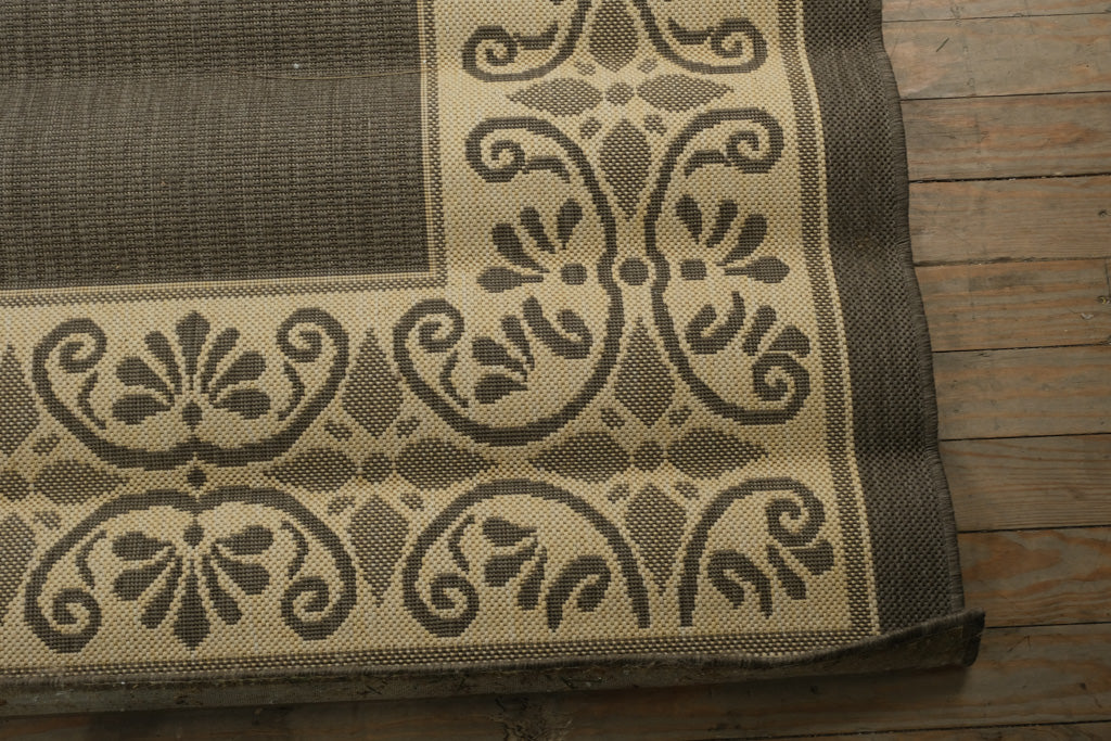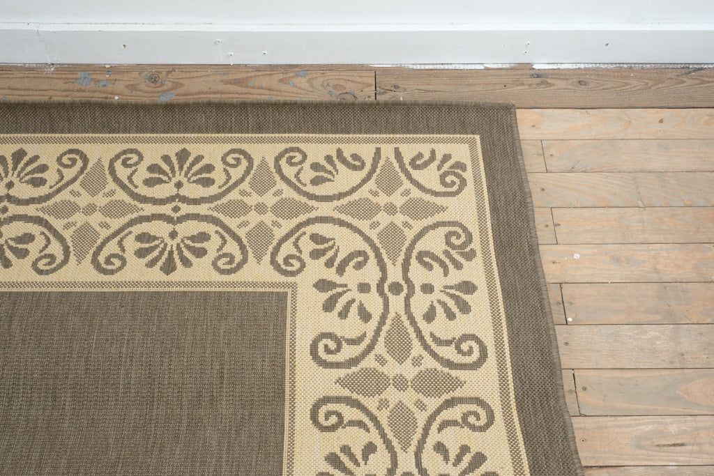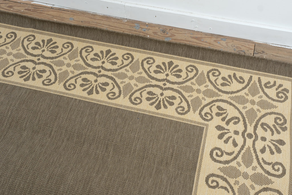 This generously scaled Capel Solaria area rug presents a calm, architectural presence through its restrained palette and repeating ornamental border. The design centers on a solid cocoa-brown field framed by a wide cream border featuring scrolling classical motifs and geometric accents, creating a look that is both timeless and quietly decorative.