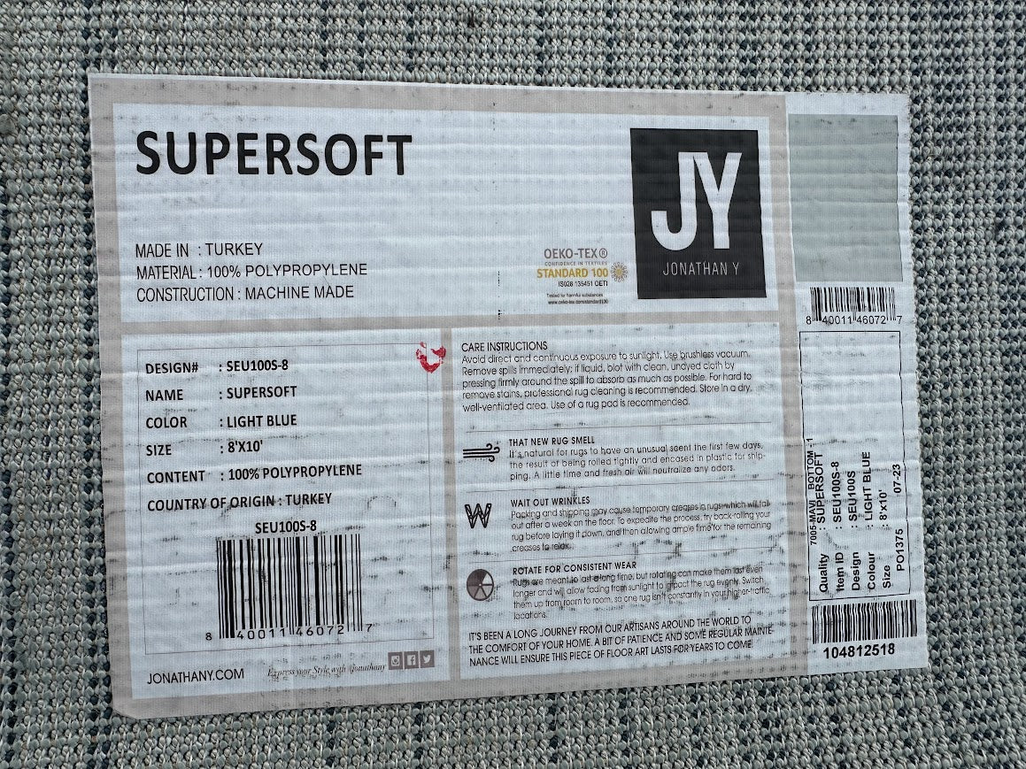 This Jonathan Y Supersoft area rug brings a clean, calming presence to any room with its soft light blue tone and velvety texture. Designed for modern and transitional interiors, the subtle striated look adds visual interest without overpowering the space. Machine-made in Turkey from durable polypropylene, this rug is both comfortable underfoot and easy to maintain—ideal for living rooms, bedrooms, or home offices. Measuring 8 x 10 feet, it provides generous coverage while keeping the room feeling open and serene.
