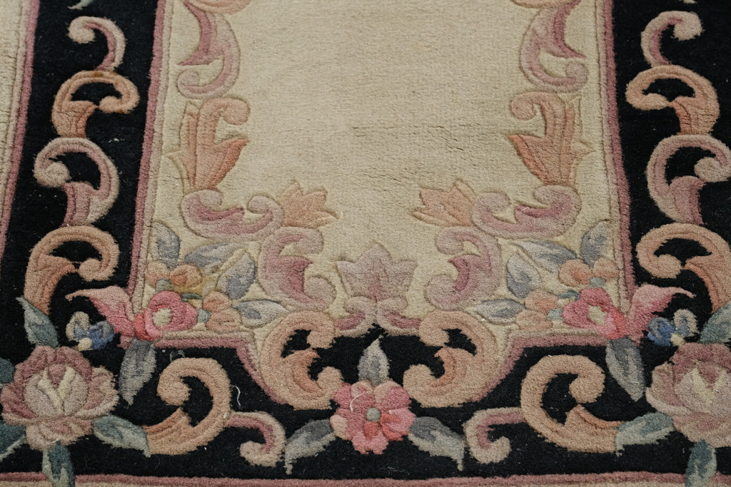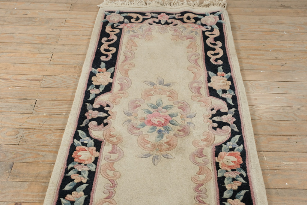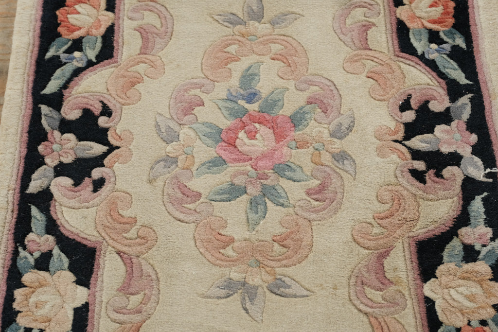 Add a touch of timeless elegance to your space with this Midnight Rose hand-tufted wool runner. Featuring a deep black border adorned with pastel roses and scrolling vine motifs, the design is beautifully framed around a warm beige center field with a soft central floral medallion.
