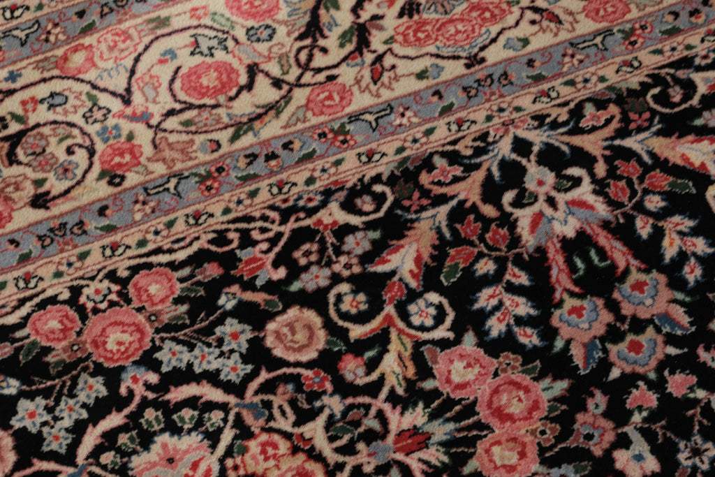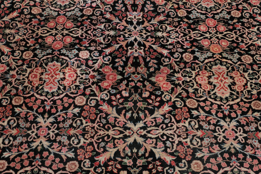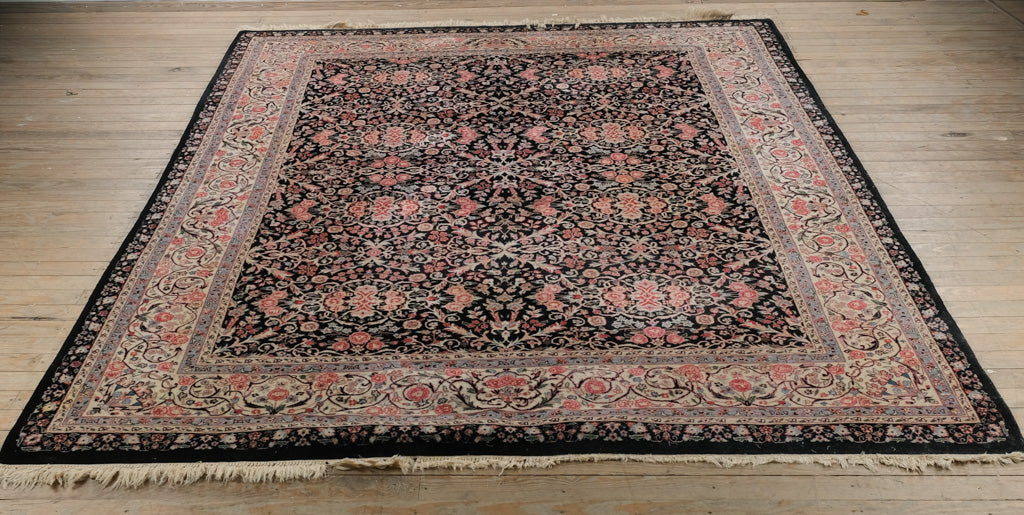 Elegant and richly detailed, this Pakistani hand-knotted wool rug showcases classic floral artistry set against a deep, dramatic field, framed by an intricately patterned border. Its balanced palette of ivory, soft rose, and muted green over a dark ground gives the rug a refined presence, anchoring a room with warmth, depth, and timeless appeal.