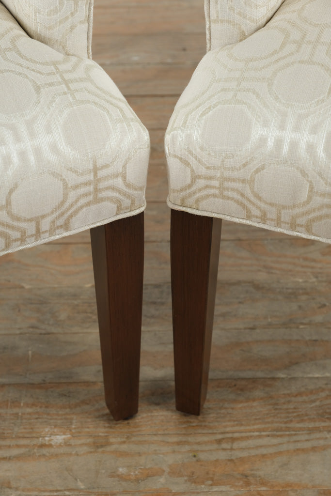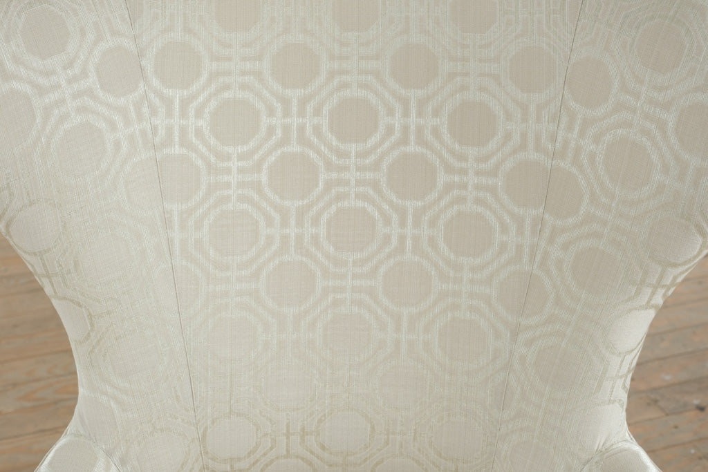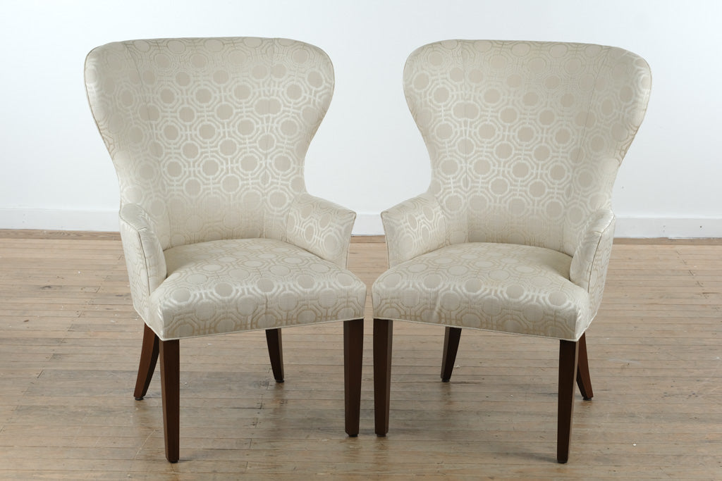 Expertly crafted by Jessica Charles—known for luxury, hand-built seating—each chair features a kiln-dried hardwood frame, high-resiliency cushioning, and professionally upholstered fabric with a subtle geometric circle motif. The tall, sculpted backrests and clean, tapered legs highlight the brand’s commitment to artisan construction and elevated comfort.