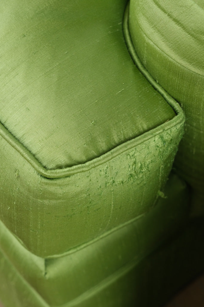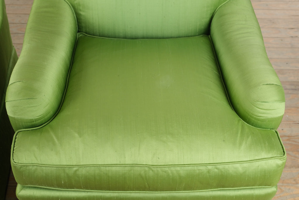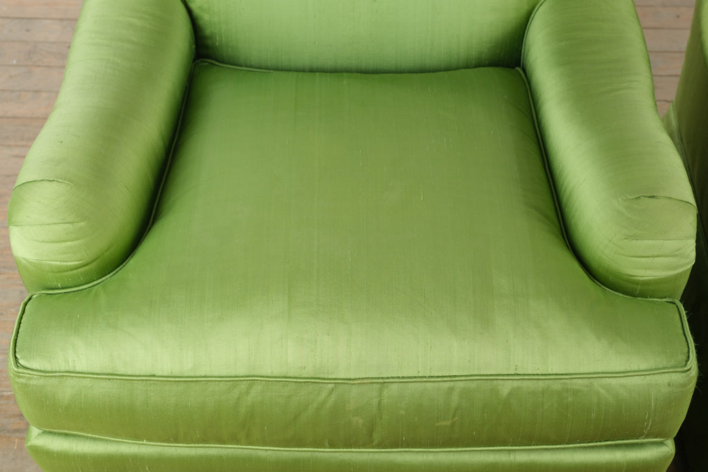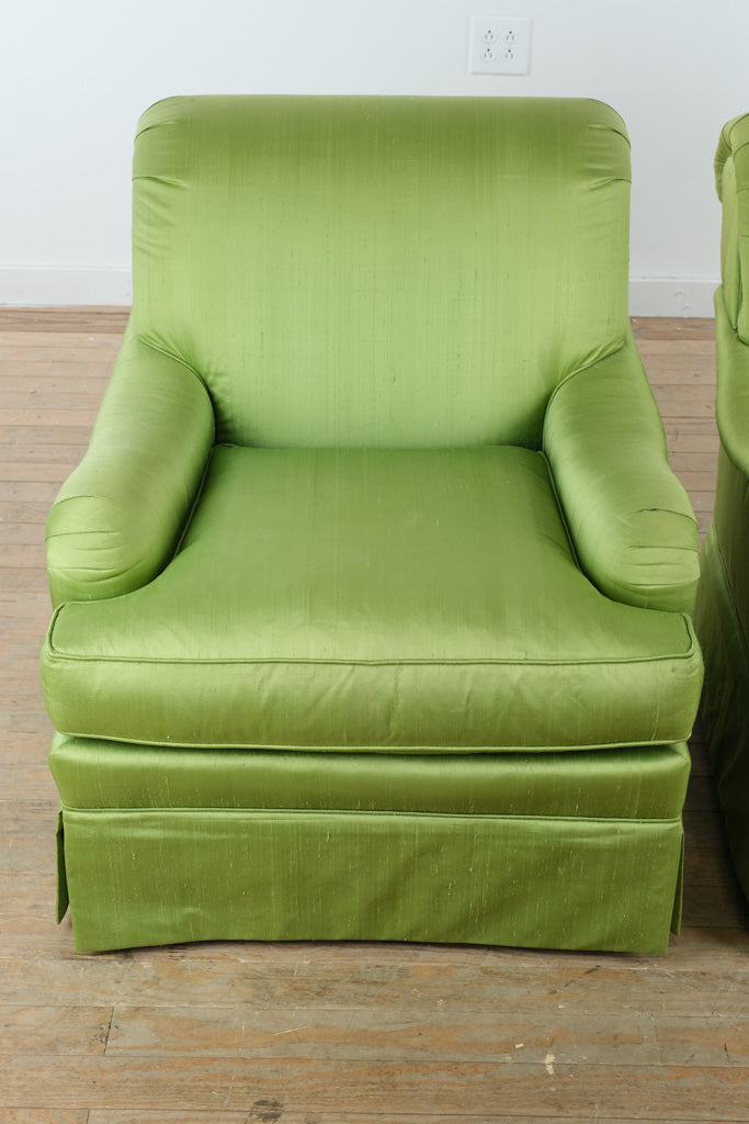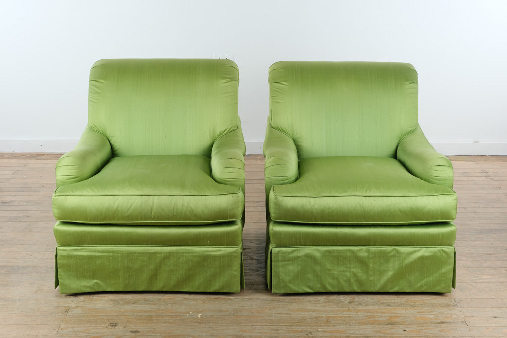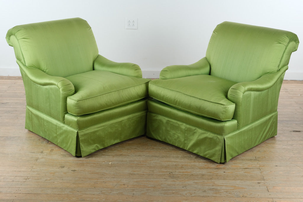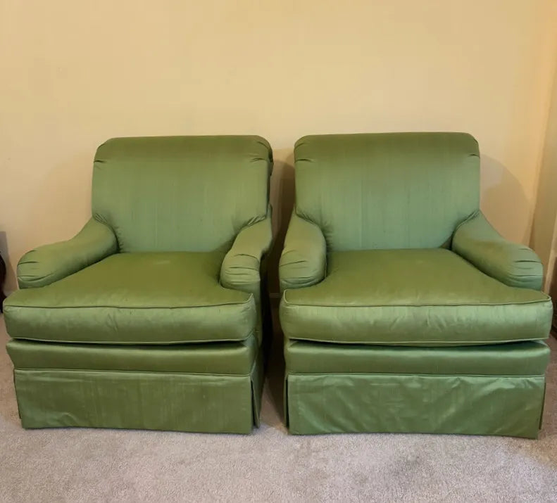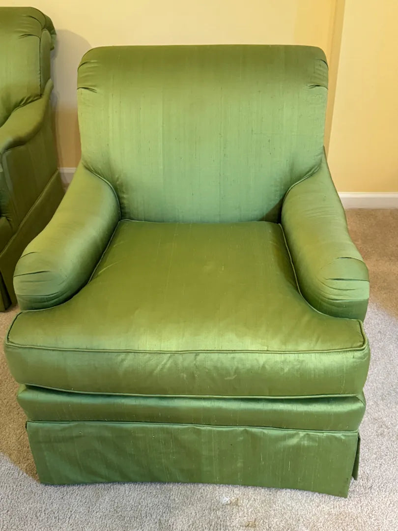 Elegant, substantial, and exceptionally well made, this pair of high-end lounge chairs by Councill Craftsmen exemplifies refined American upholstery at its best. Upholstered in a soft green fabric with a subtle sheen, these chairs offer generous proportions, tailored silhouettes, and an inviting presence that reflects their premium construction and enduring quality.