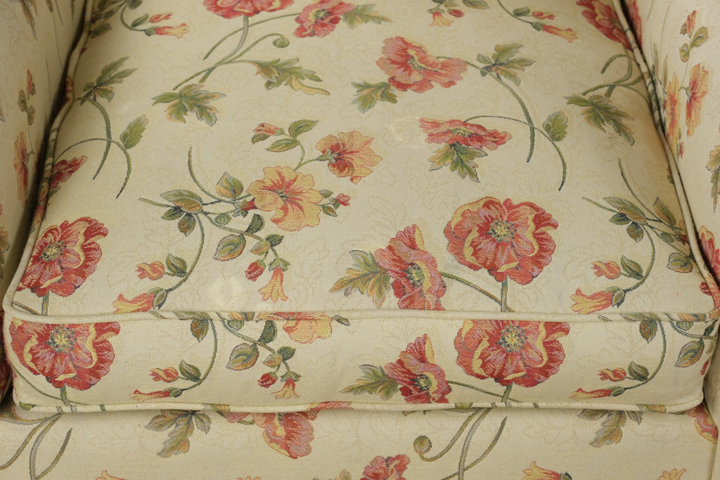 A beautifully coordinated pair of wingback chairs offering Joe Ruggiero’s signature comfort, craftsmanship, and timeless floral elegance.