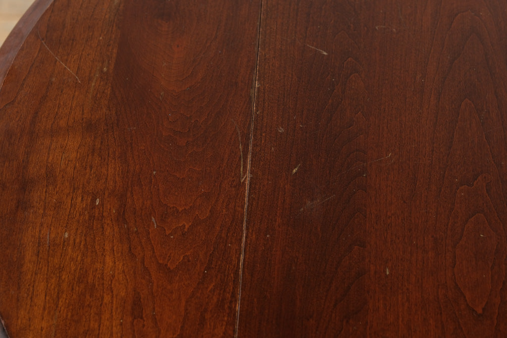 Constructed entirely from solid cherry, this table showcases the fine woodworking and joinery characteristic of quality American furniture makers such as Ethan Allen or Pennsylvania House. The smooth drop-leaf design expands for additional surface area when needed, while turned legs and a warm hand-rubbed finish highlight the natural beauty of the wood grain.
