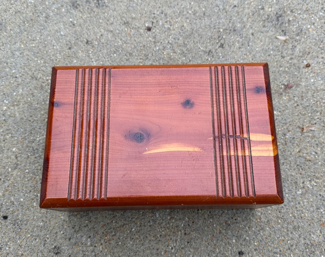 Beautiful vintage cedar keepsake box, likely handcrafted and gifted in the early 1940s. This charming wooden trinket chest features dovetail joinery, elegant fluted carvings on the lid, and rich natural wood grain with that unmistakable aromatic cedar scent. Inside the lid, a faint hand-etched inscription reads “Got it 1942 Christmas,” adding a touch of authentic period charm and sentimental history.