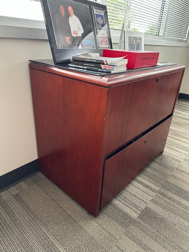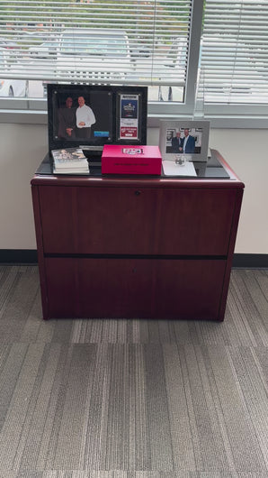 This 2-drawer lateral file cabinet combines practicality with a professional look in a rich mahogany laminate finish. Offering generous storage for letter- or legal-size files, it’s ideal for keeping important documents organized and accessible. The sturdy design and locking drawers make it a reliable choice for office or home use.