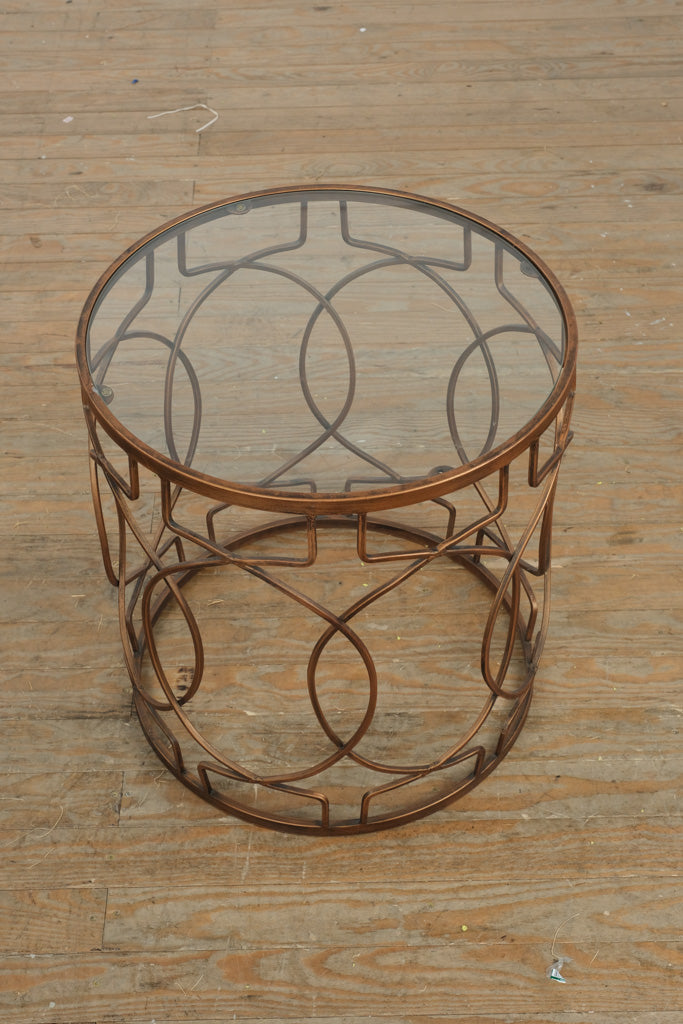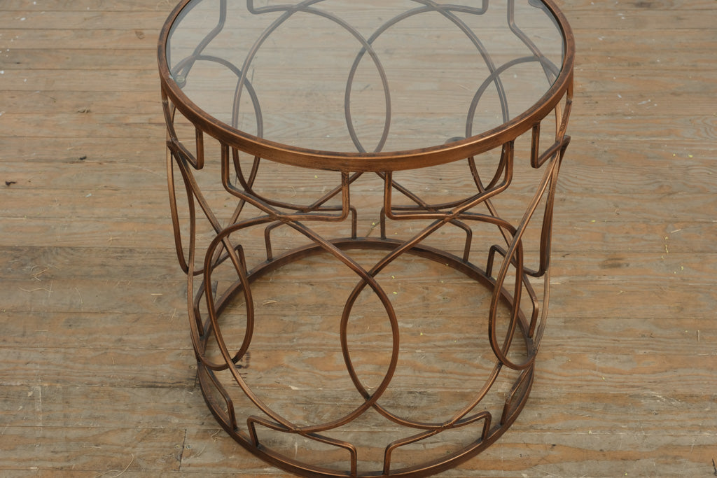 Graceful geometric lines and a warm metallic finish give this vintage-inspired accent table a timeless sculptural appeal. The round glass top creates an airy presence, while the open metal base adds architectural interest — perfect as a side table or statement piece in any refined living space.
