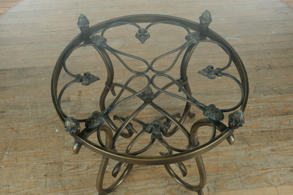 Expertly forged from solid metal with a rubbed bronze finish, the ornate base showcases fluid scrollwork and leaf-inspired accents that evoke hand-wrought iron artistry. The thick, tempered glass top rests securely on decorative acorn supports, offering both durability and refined sophistication. Each element reflects quality craftsmanship and balanced design.