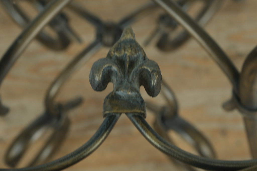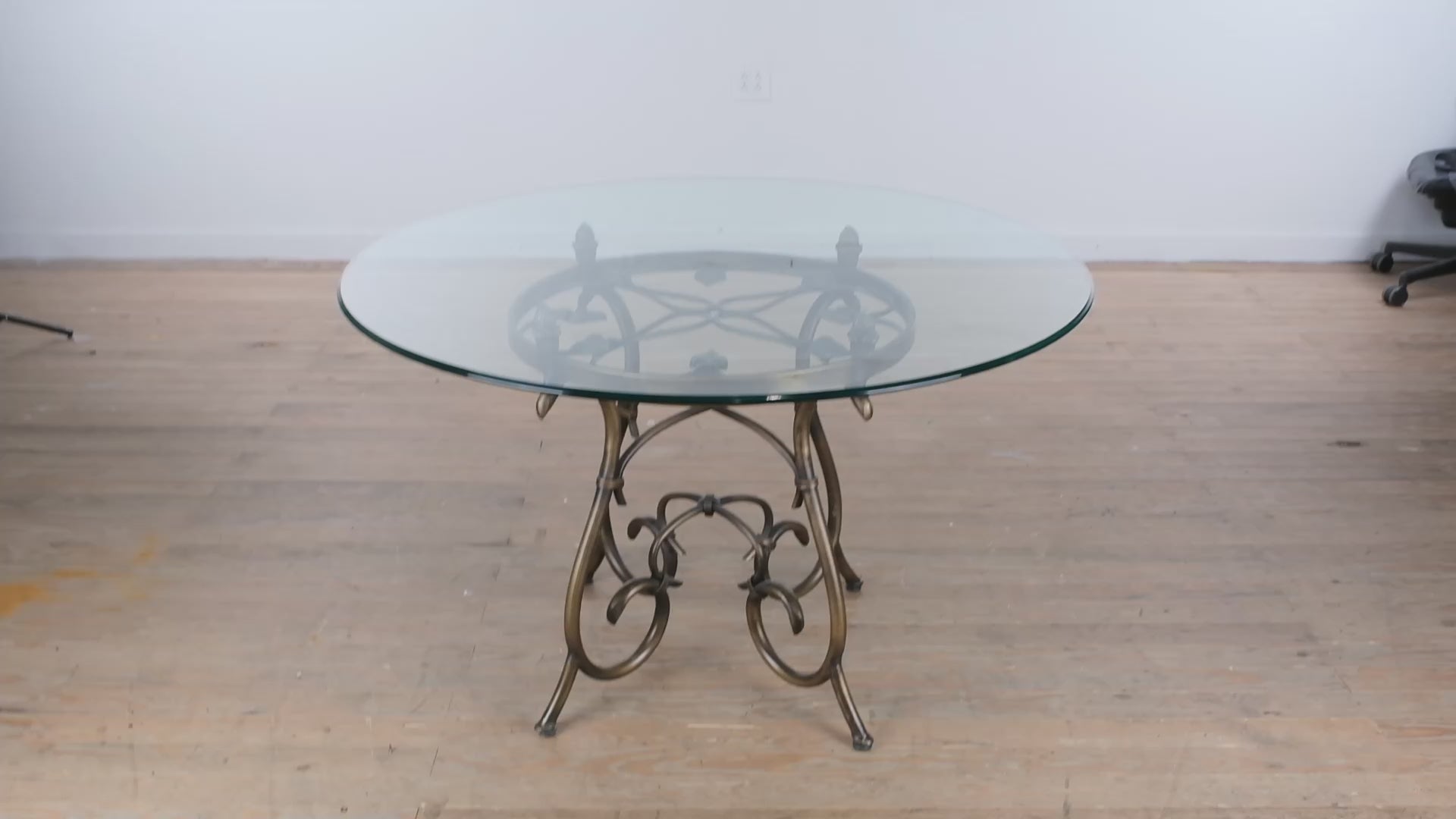 An elegant blend of classic artistry and modern transparency, this round dining table features a sculptural rubbed bronze base supporting a beveled glass top. The gracefully curved metalwork and acorn finial detailing lend a timeless European charm, while the clear glass surface enhances light and space within any room. Perfectly proportioned for dining, conversation, or as a statement centerpiece.
