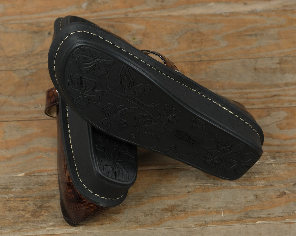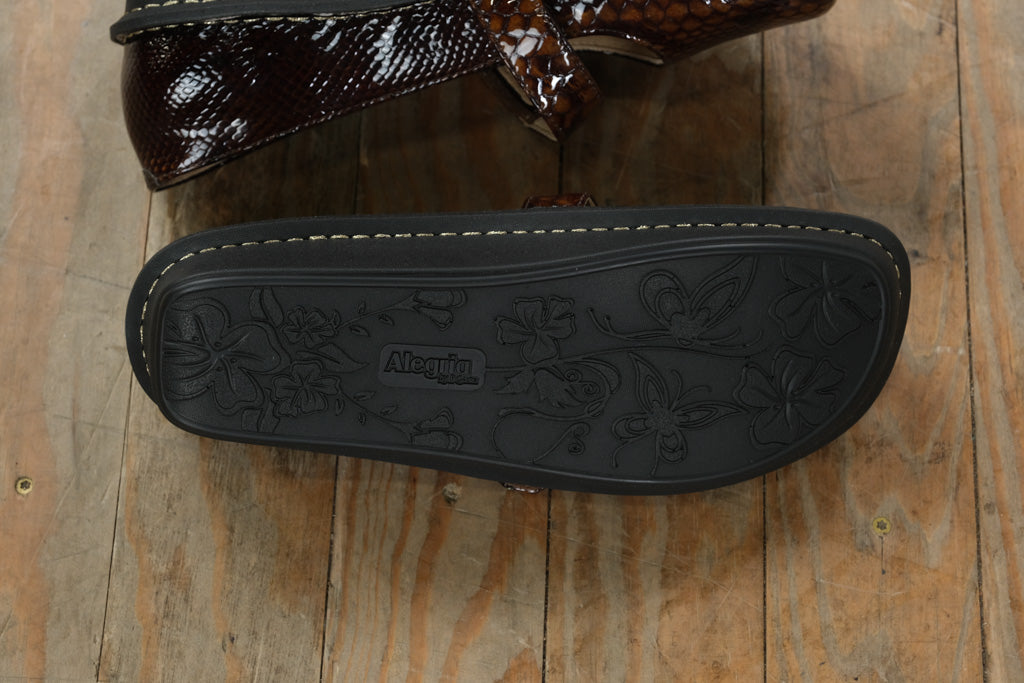 Step into Alegria comfort with this striking pair of Choco Patent Snake Mary Janes, style FEL-713. Featuring Alegria’s signature cushioned footbed, supportive rocker outsole, and a rich glossy snakeskin-patterned upper, these shoes offer all-day comfort with a fashionable edge.
