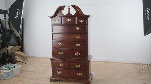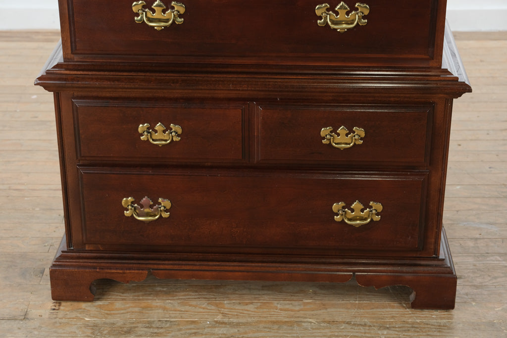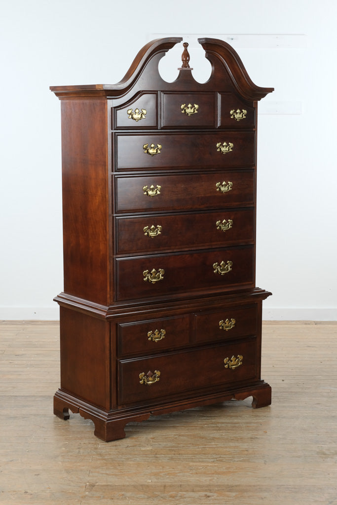 A refined and stately American Drew tall boy dresser, beautifully crafted in rich cherry wood with classic Chippendale influences. Distinguished by its broken arch pediment, brass hardware, and exceptional proportions, this piece captures the timeless sophistication of 18th-century design while offering thoughtful modern functionality.
