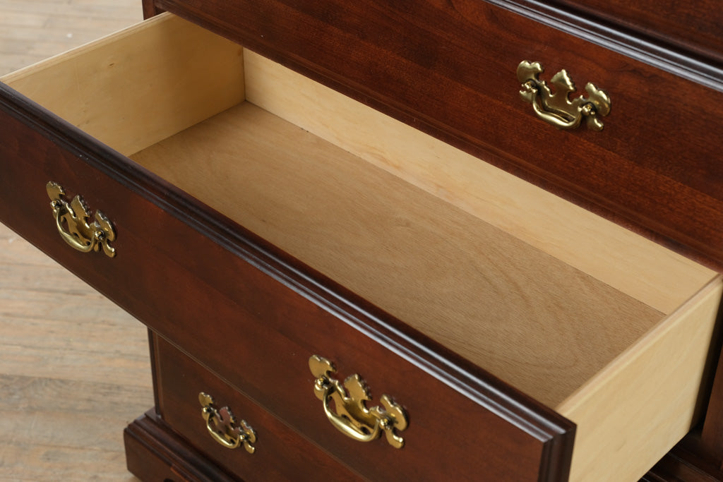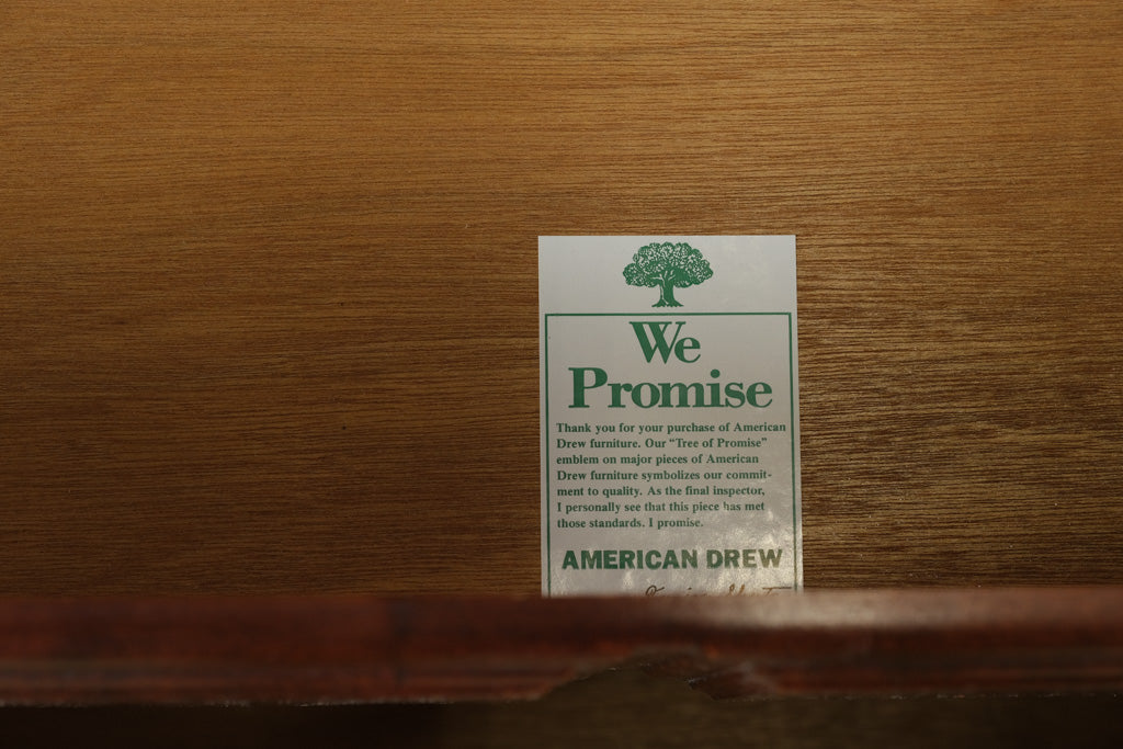 Expertly built from solid cherry with a hand-rubbed finish, this American Drew dresser highlights the brand’s commitment to enduring quality. The piece features seven drawers — including two shallower top drawers for accessible storage — and elegant bracket feet instead of the more common Queen Anne legs, lending it a grounded, architectural presence. Polished brass Chippendale-style pulls accent the warm wood grain with traditional charm.