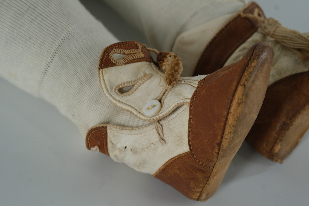 Clothing appears handmade and shows signs of age, minor wear, and some loose stitching consistent with antique textiles.