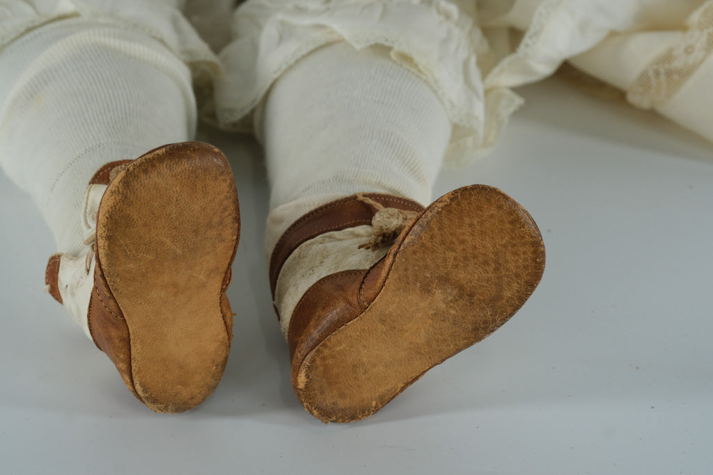 Her ensembleācomplete with hand-stitched details and age-worn authenticityāevokes the charm and quiet dignity of Victorian-era playthings. This doll presents beautifully for display and would make a meaningful addition to any antique doll or Americana collection.