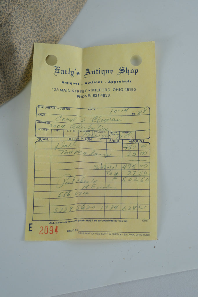 Includes original 1988 Earlyās Antique Shop receipt, referencing āAntique Dollā purchase