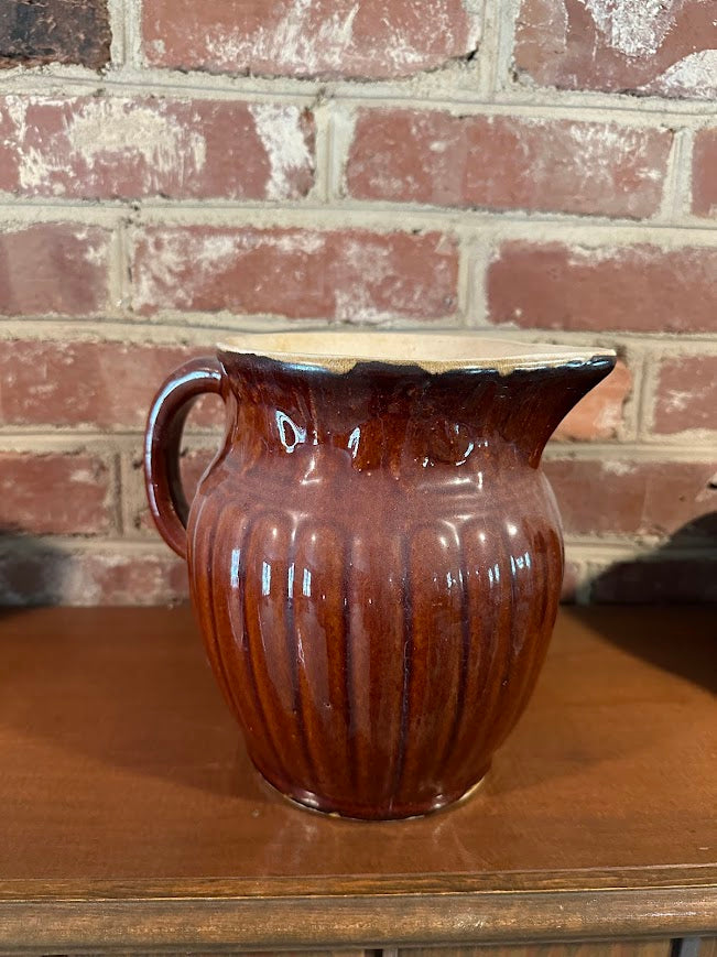 This handsome antique pottery pitcher features a rich brown Albany slip glaze with subtle ribbing along the body and a soft scalloped rim near the top. Hand-thrown and finished with a deep, glossy glaze that captures the warm tones of natural clay, it reflects the enduring quality of early American utilitarian pottery.