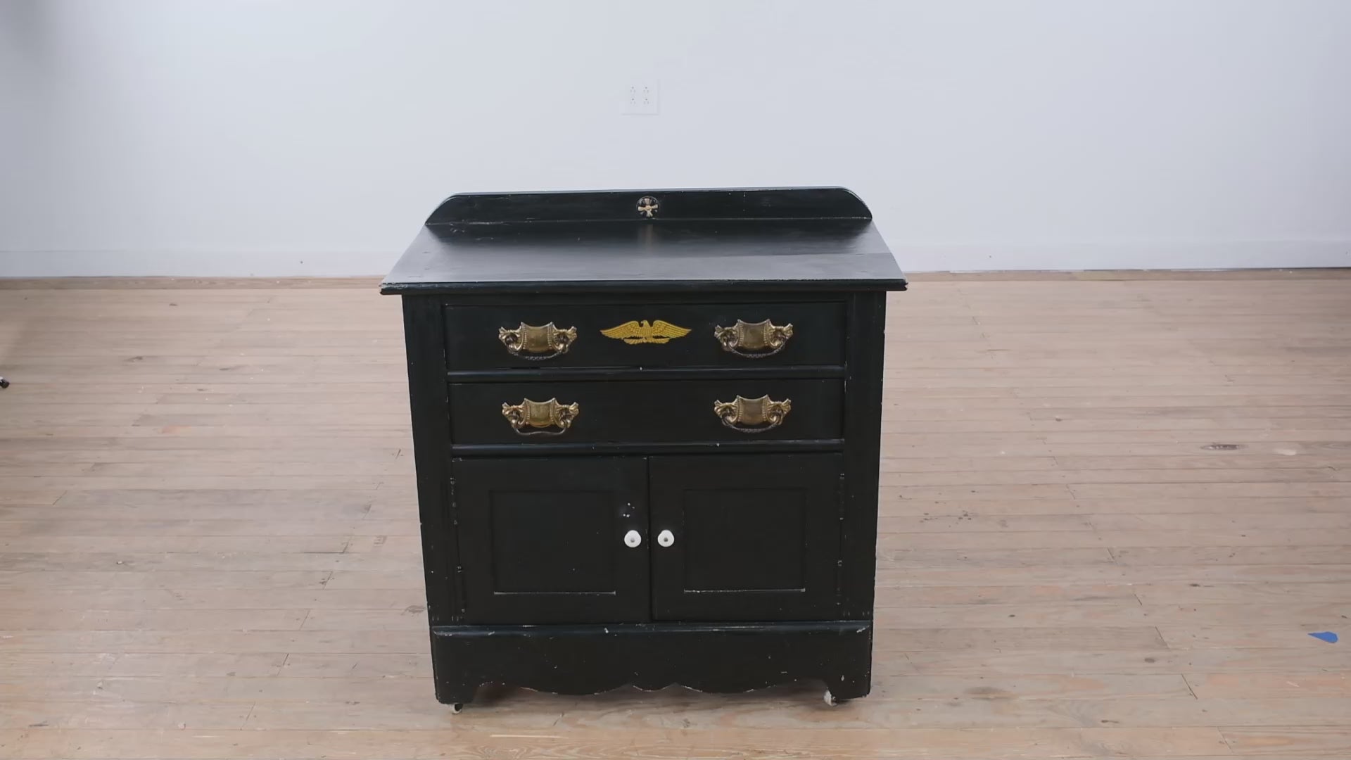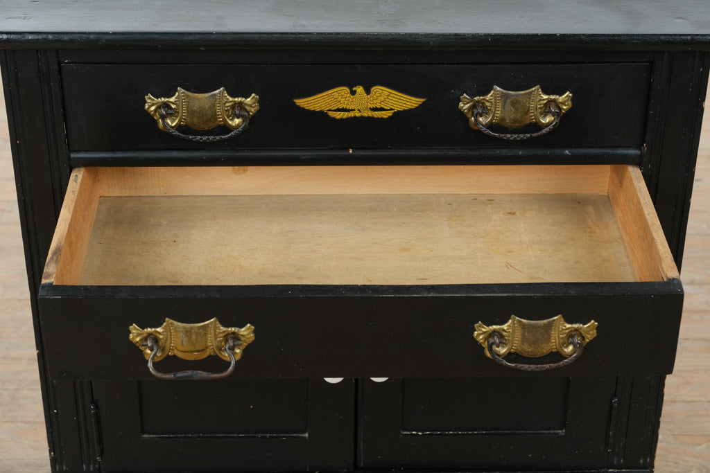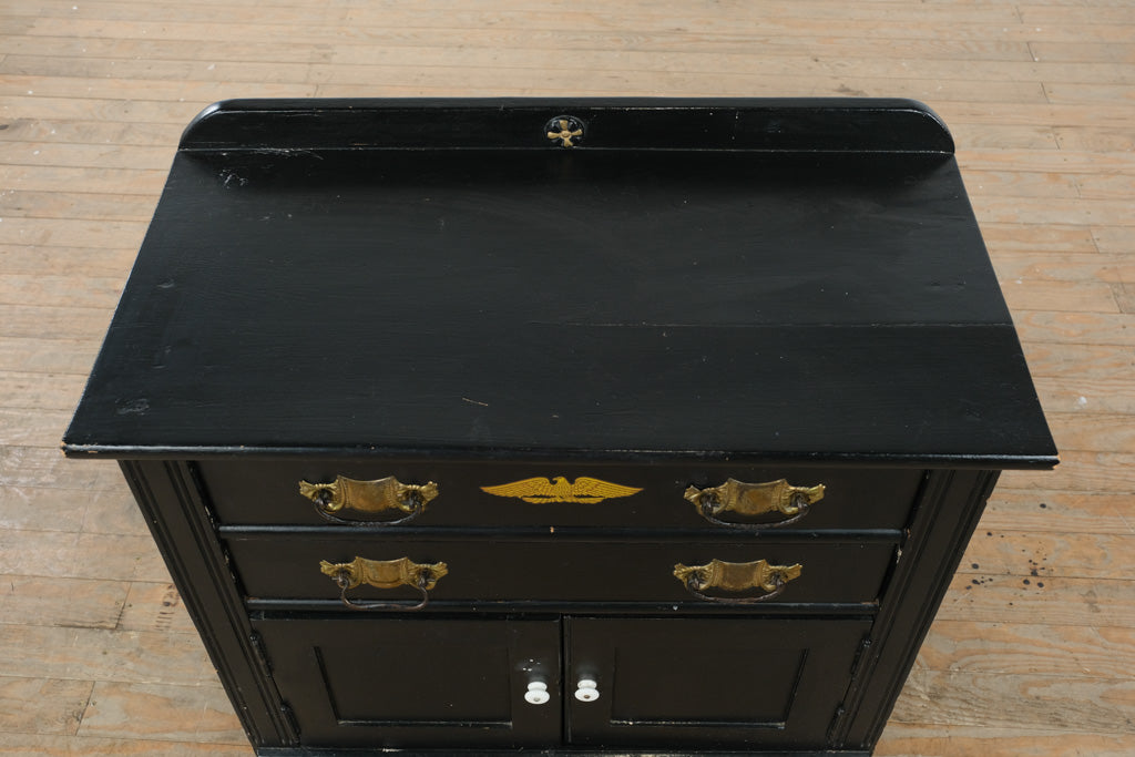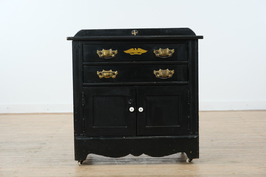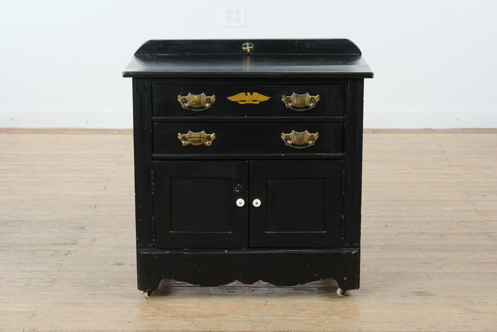 This delightful antique wash cabinet brings a touch of early farmhouse character and timeless utility to any room. Originally crafted as a washstand, it features classic paneled doors, solid wood construction, and a short backsplash along the back edge. The piece has been later painted in a deep black tone and accented with a decorative stenciled motif across the top drawer, giving it a distinctive, updated look while preserving its old-world charm.
