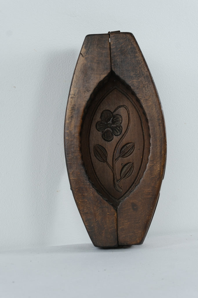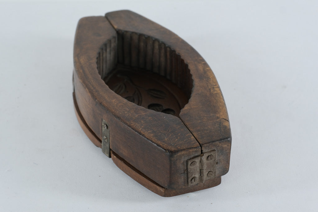 This beautifully crafted antique wooden butter mold showcases traditional folk art craftsmanship with a striking carved floral motif at its center. Made from solid hardwood and constructed in hinged sections, the mold opens to reveal a deeply carved interior designed to shape and decorate butter for presentation—an important domestic art in 18th–19th century rural households.