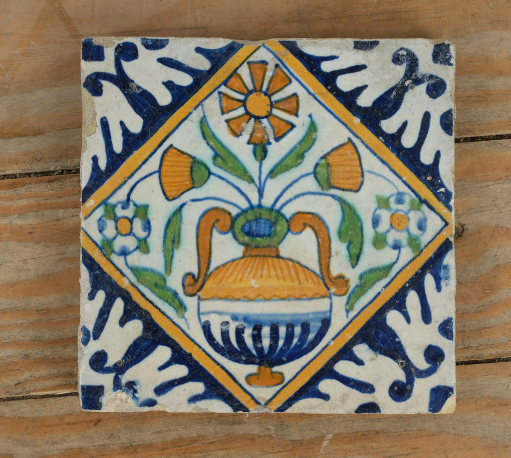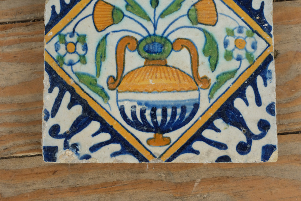 A striking and beautifully hand-painted antique Delft polychrome tile featuring a vivid floral vase motif framed in an intricate diamond border. Crafted in the Netherlands during the late 17th to early 18th century, this tile showcases the rich palette and decorative complexity of Dutch faience at its height — deep cobalt blue, warm ochre, and soft green glazes brought together under a smooth tin glaze.