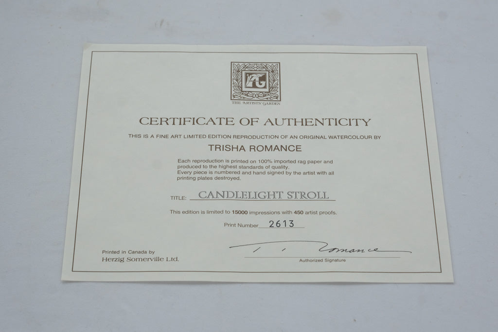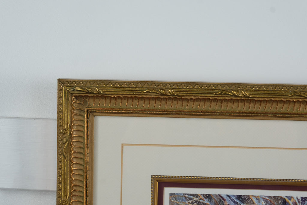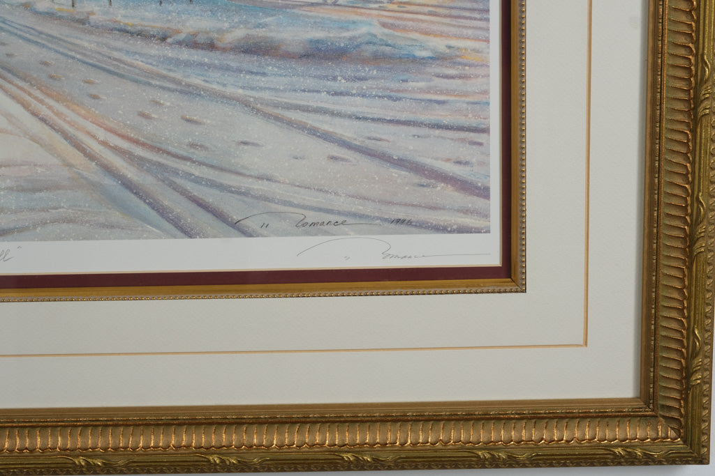 This collectible piece is hand-signed and numbered (2613/15000) by Trisha Romance and includes the original Certificate of Authenticity from The Artist’s Garden. Professionally framed in an elegant gold-tone frame with ivory and burgundy double matting, it’s ready to display as the centerpiece of your seasonal décor or fine art collection.