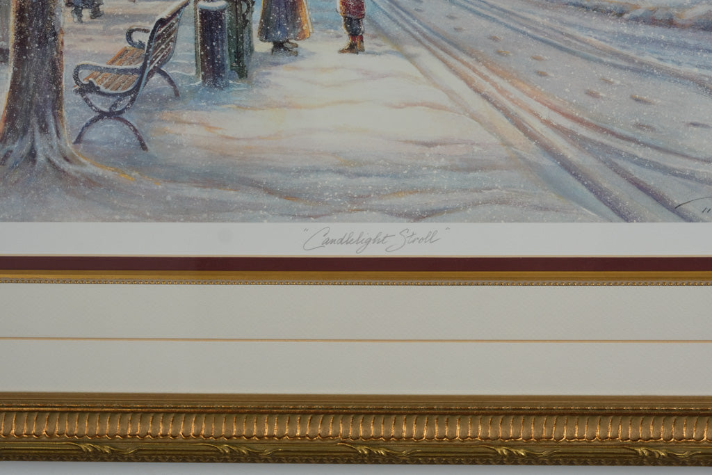 Embrace the warmth and wonder of the holiday season with “Candlelight Stroll” by Trisha Romance, one of her most cherished winter scenes. This fine art limited edition print depicts a snow-covered village illuminated by the soft glow of streetlamps and shop windows as families and children gather for an evening walk beneath twinkling lights. Romance’s delicate brushwork and gentle color palette capture the essence of community, peace, and nostalgia that define her signature style.