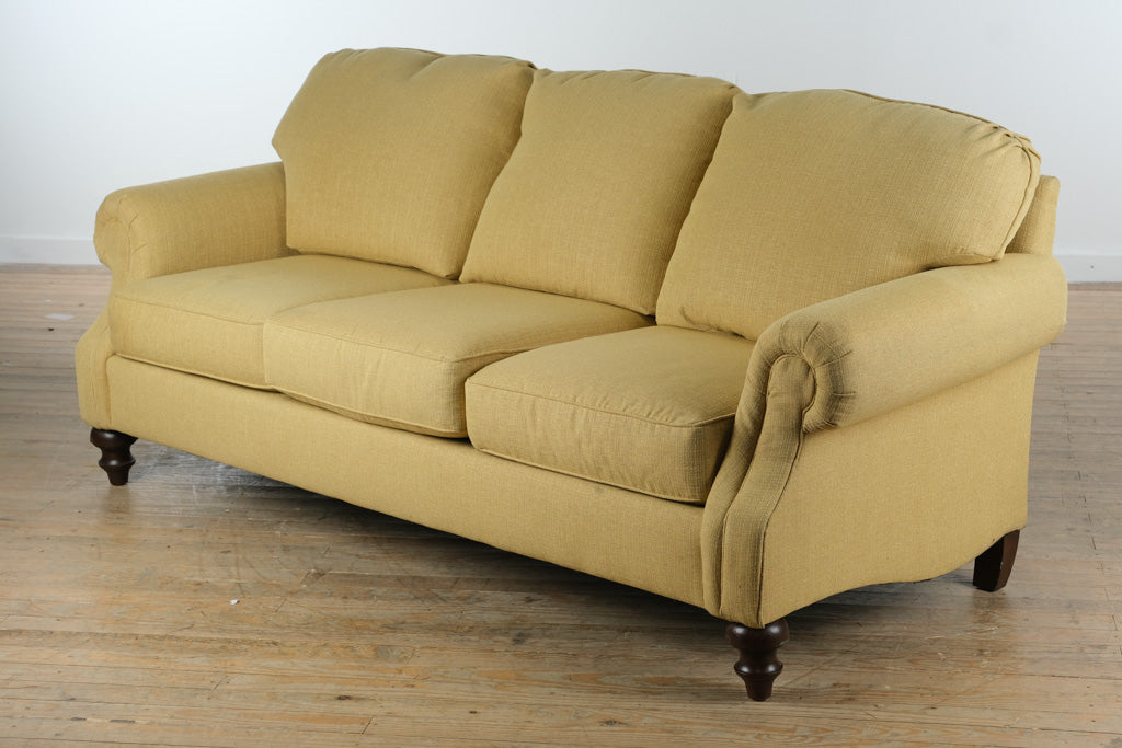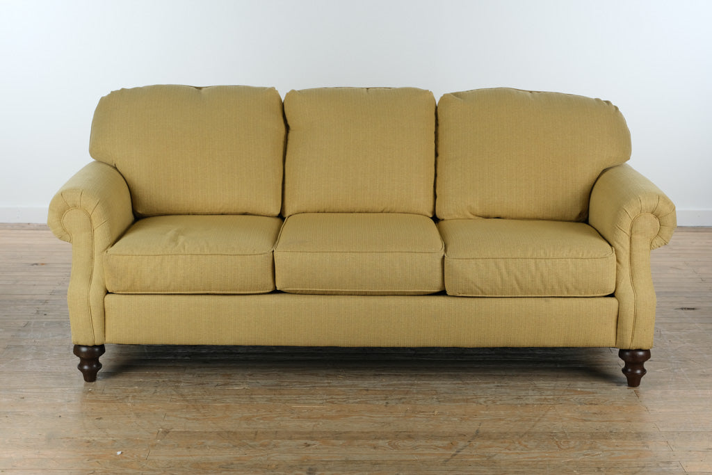 A timeless blend of elegance and comfort, this handcrafted Clayton Marcus sofa embodies the brand’s signature attention to detail and enduring quality. Its warm golden wheat upholstery and classic rolled arms lend a refined charm that suits both traditional and transitional interiors.