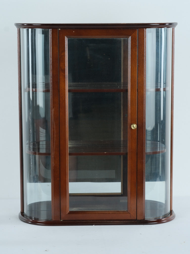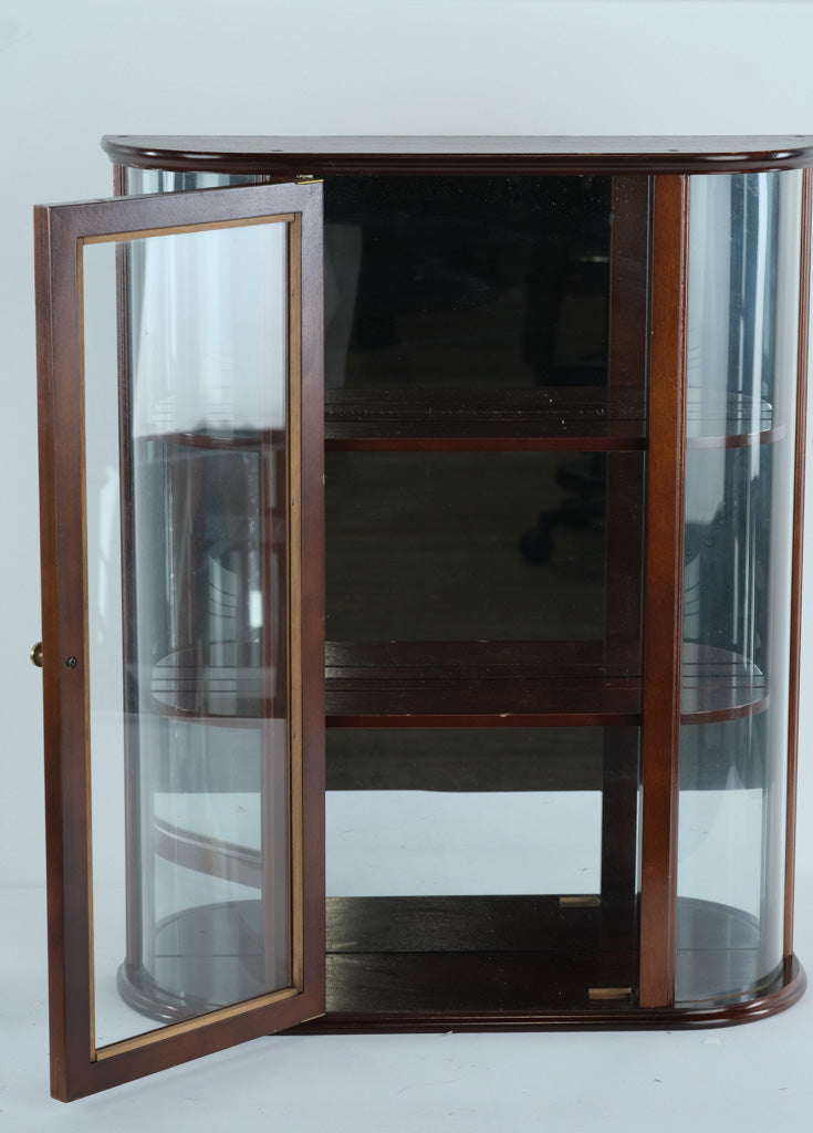 This elegant wall-mounted display cabinet features a classic curved glass design paired with a rich wood finish, making it an ideal piece for showcasing collectibles, glassware, small antiques, or décor. The gently bowed glass sides add visual depth and refinement, while the front glass door with brass-tone knob provides easy access and protection for displayed items.