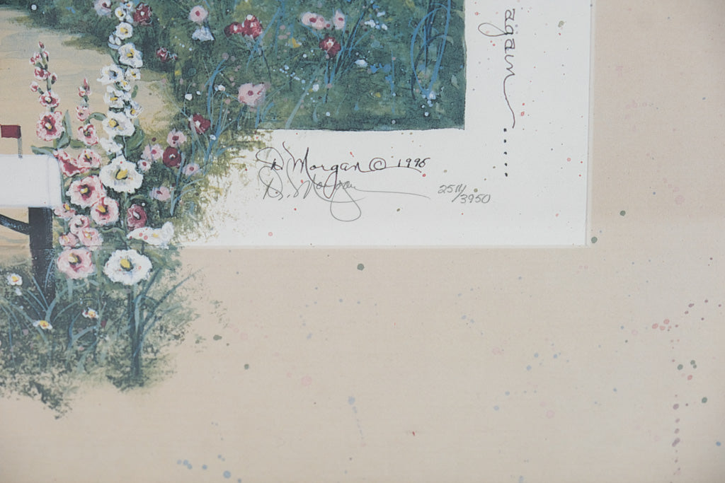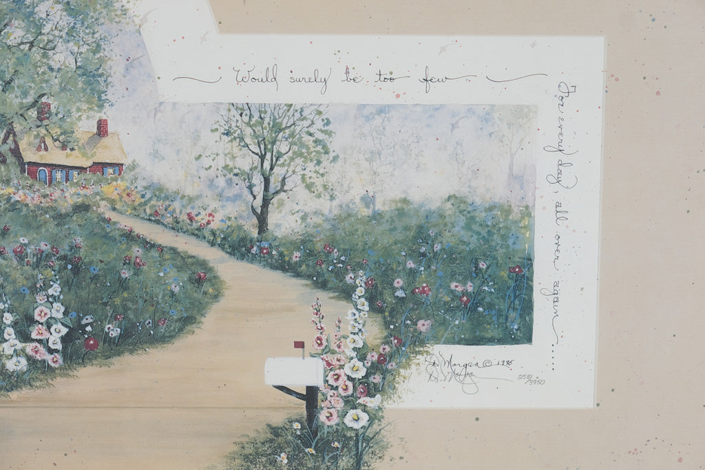 Bring warmth and sentiment to your home with this charming limited edition D. Morgan print, titled "One Hundred Years Together" (©1996). The artwork captures a nostalgic countryside path leading to a cozy cottage surrounded by blooming flowers and towering trees, beautifully rendered in D. Morgan’s signature whimsical style.