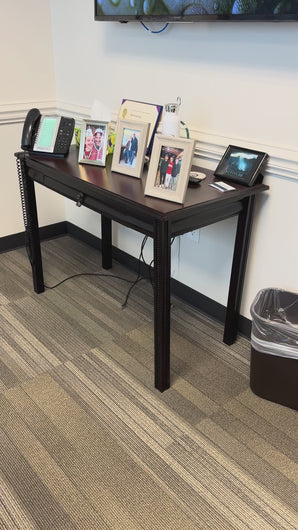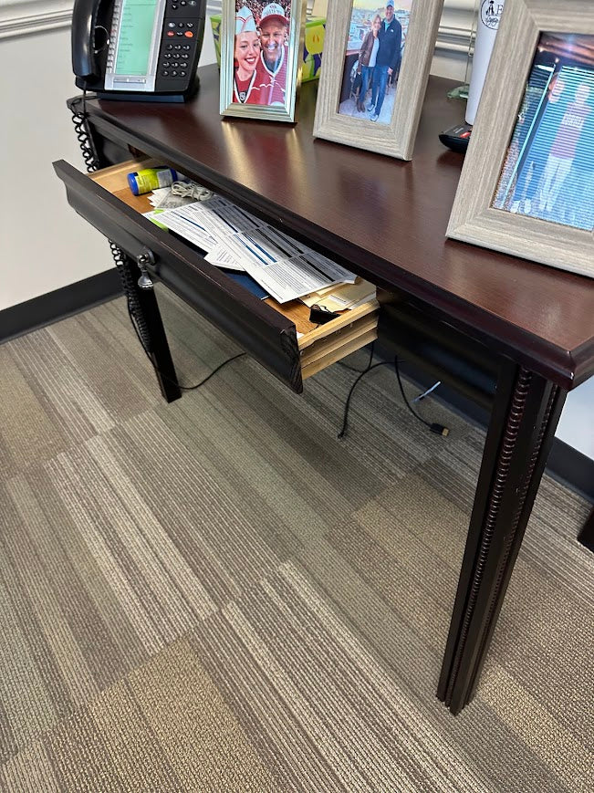 This elegant console table features a classic silhouette and refined detailing, ideal for use in entryways, behind a sofa, or as an accent in offices and living spaces. The rich mahogany finish highlights its clean lines, while the single center drawer offers convenient storage for essentials. Decorative beaded trim along the legs adds a touch of craftsmanship and character.