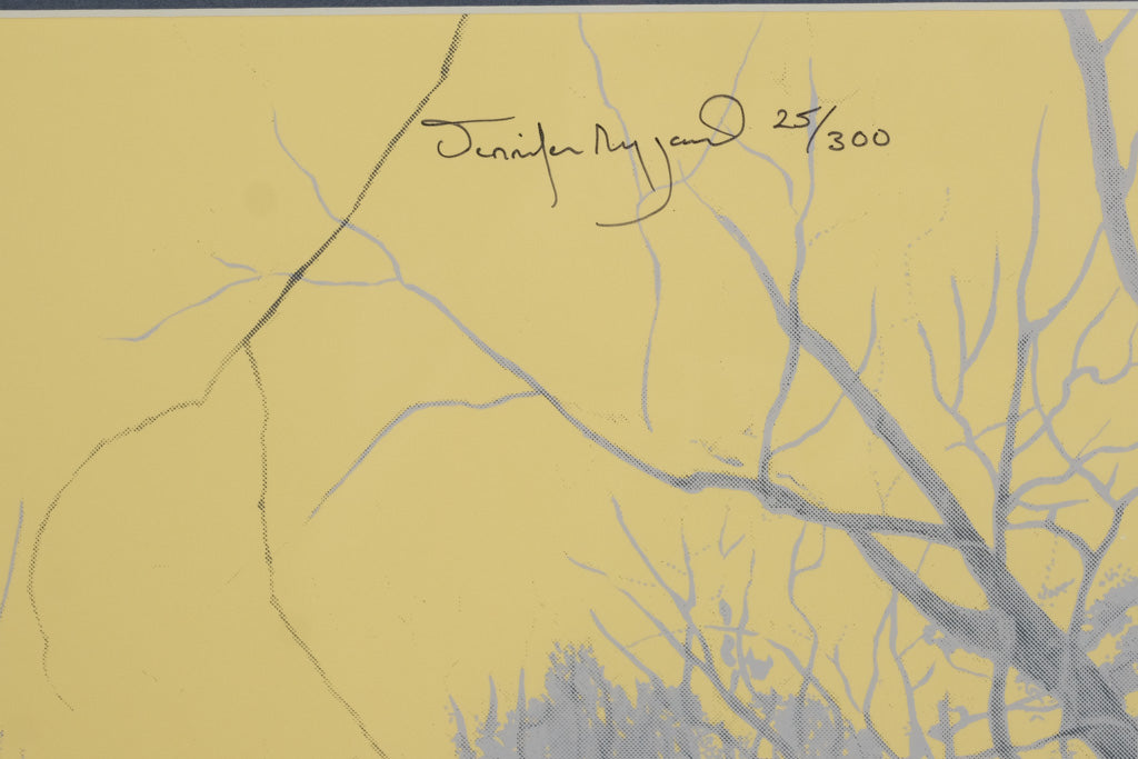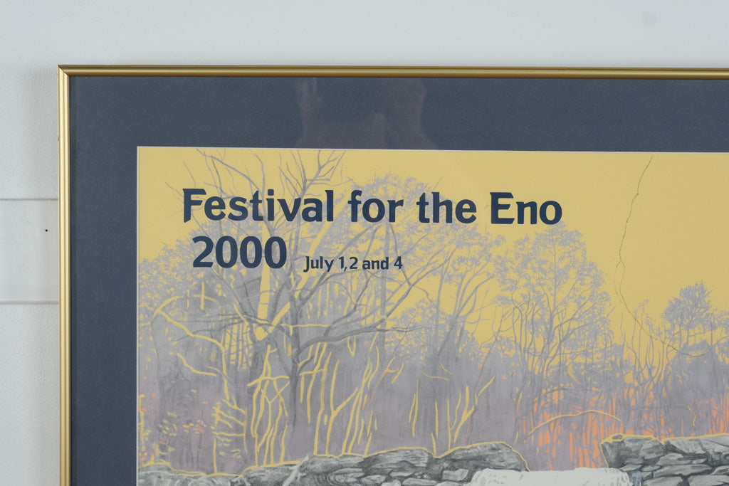 Vibrant limited edition poster created for the 2000 Festival for the Eno, an annual music and arts event held along the Eno River in Durham, North Carolina. The artwork, by Jennifer Myhand, beautifully depicts a waterfall and surrounding landscape in a bold graphic style.