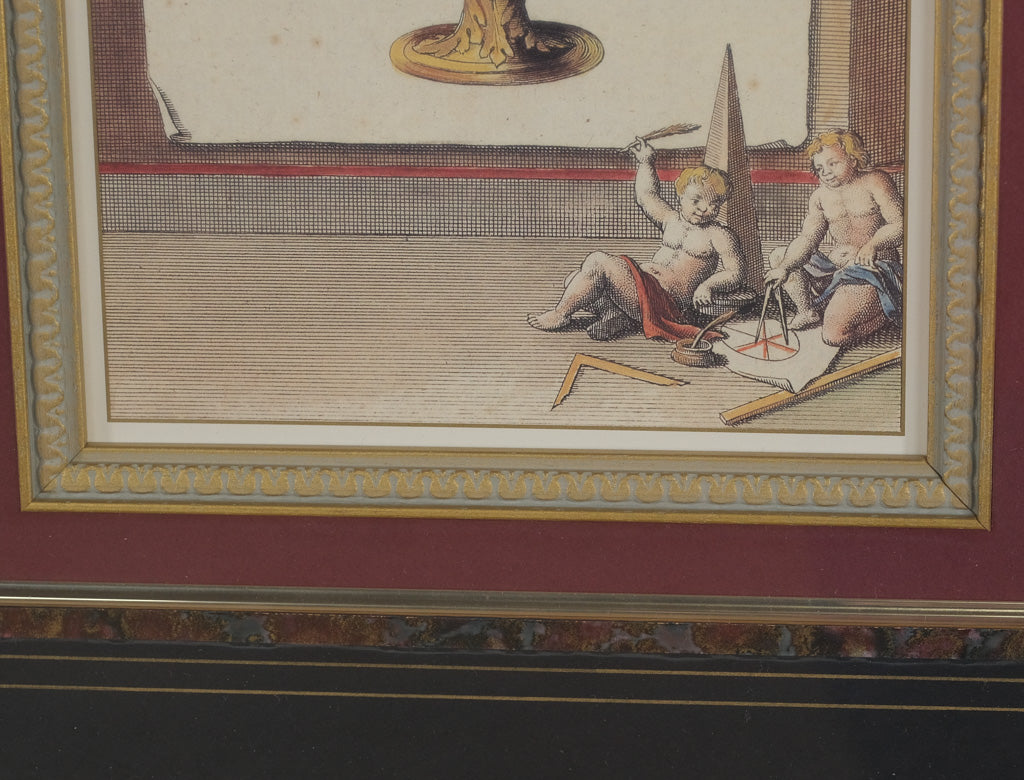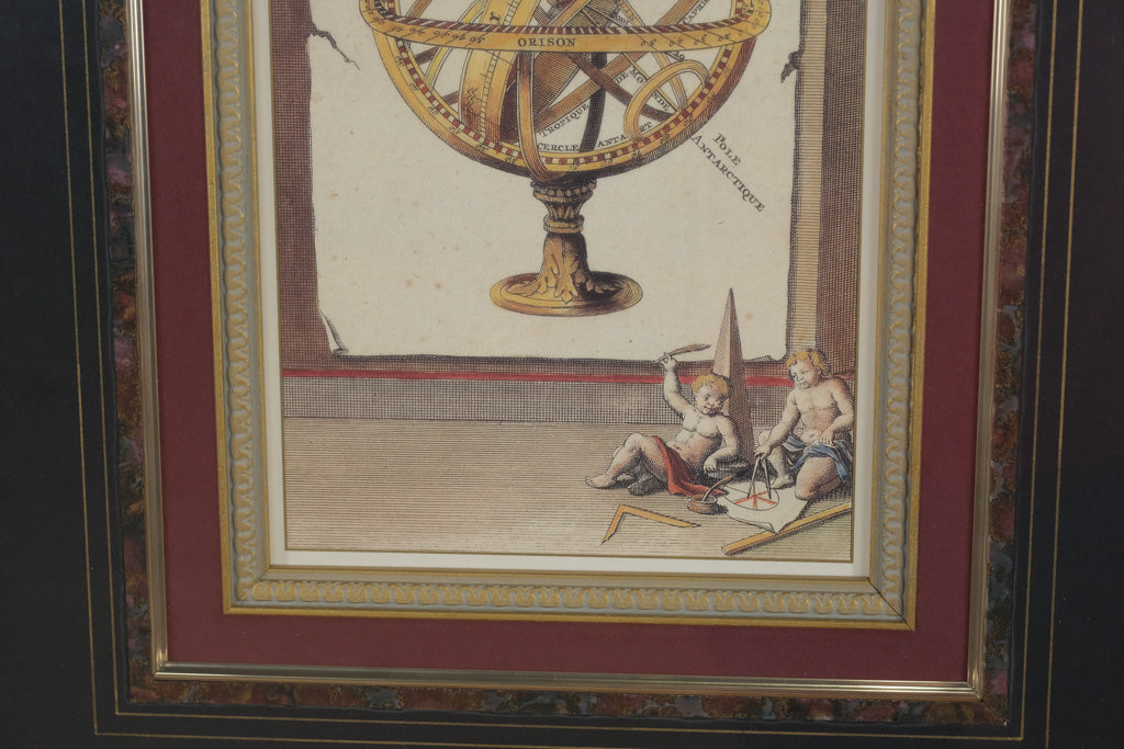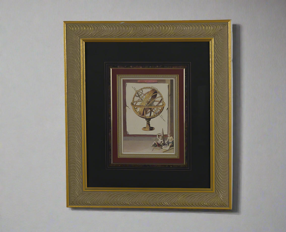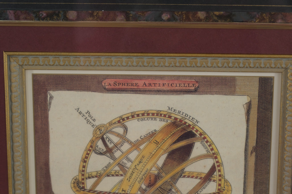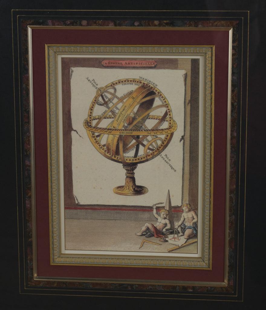 Add a touch of classical science and timeless style to your décor with this beautifully framed print, "La Sphere Artificielle." The artwork depicts an armillary sphere, a historic astronomical instrument, detailed with labeled meridians and adorned by cherubic figures at the base.