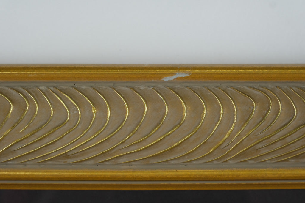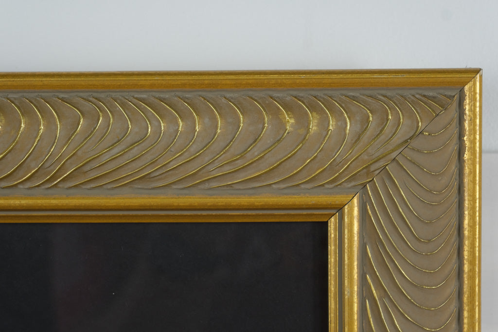 The piece is triple-matted in black, red, and gold with a decorative ornate gold frame, highlighting the rich details of the artwork. The frame itself features an embossed swirl pattern with a soft gold finish. There is a small area of finish wear along the top edge (see photos), but overall, the frame and artwork present very well.