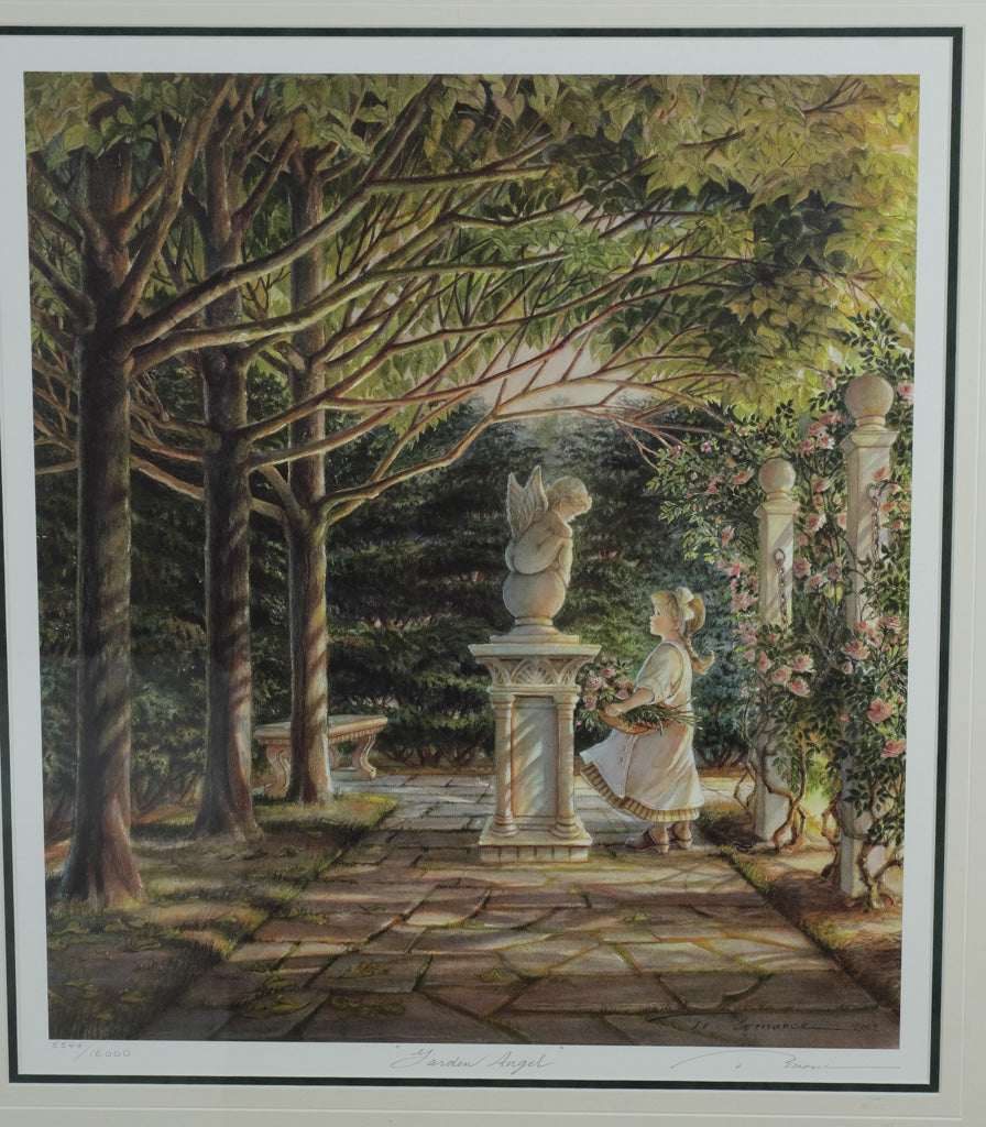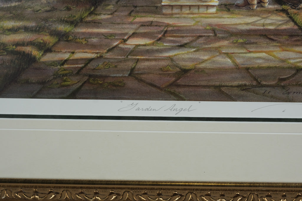 Bring home the serene beauty and tender storytelling of Trisha Romance with this enchanting limited edition print, “Garden Angel.” This piece depicts a peaceful garden bathed in golden light, where a young woman kneels before a stone angel among blooming flowers and winding trees. Romance’s delicate watercolor touch captures both tranquility and reverence — a quiet moment of reflection and grace beneath a canopy of green.